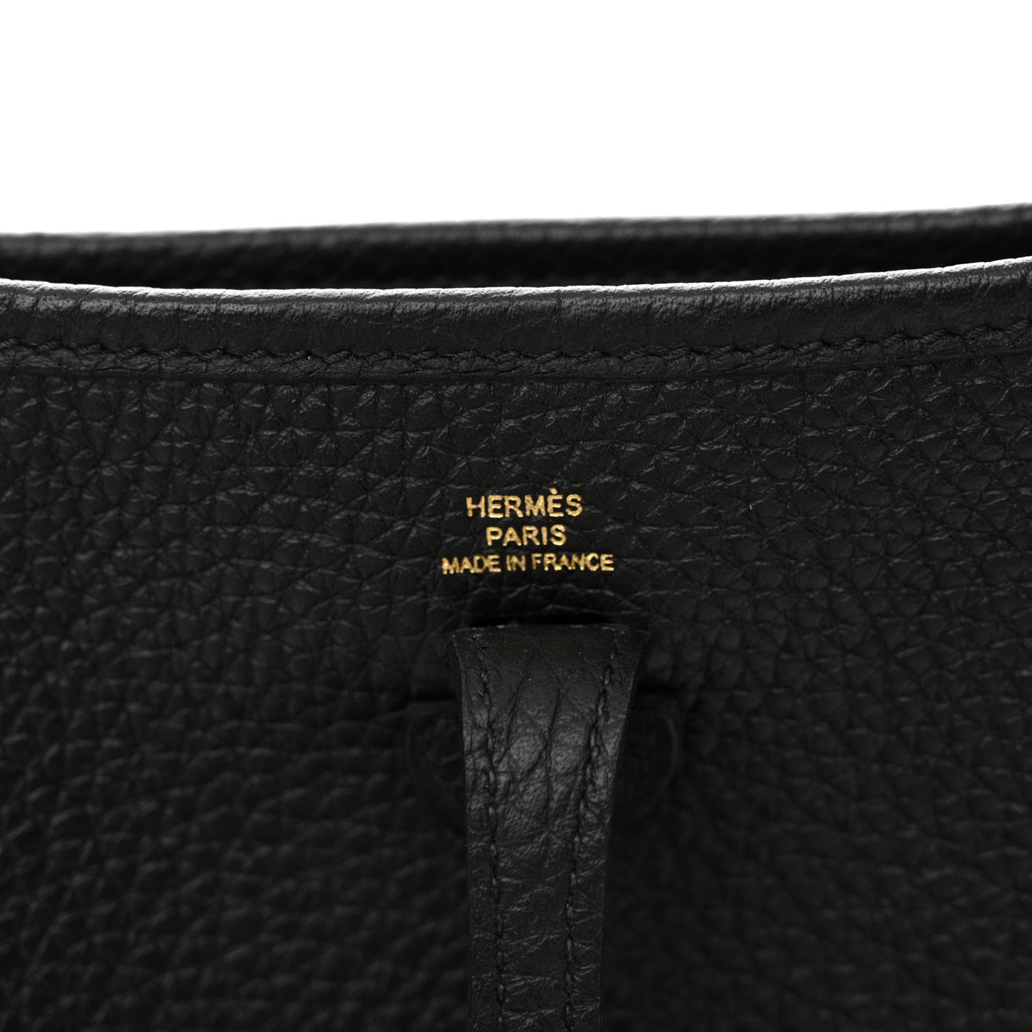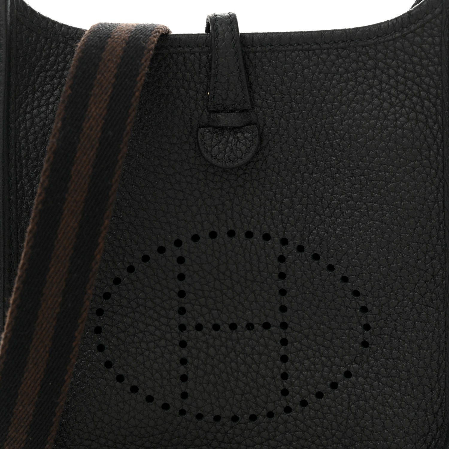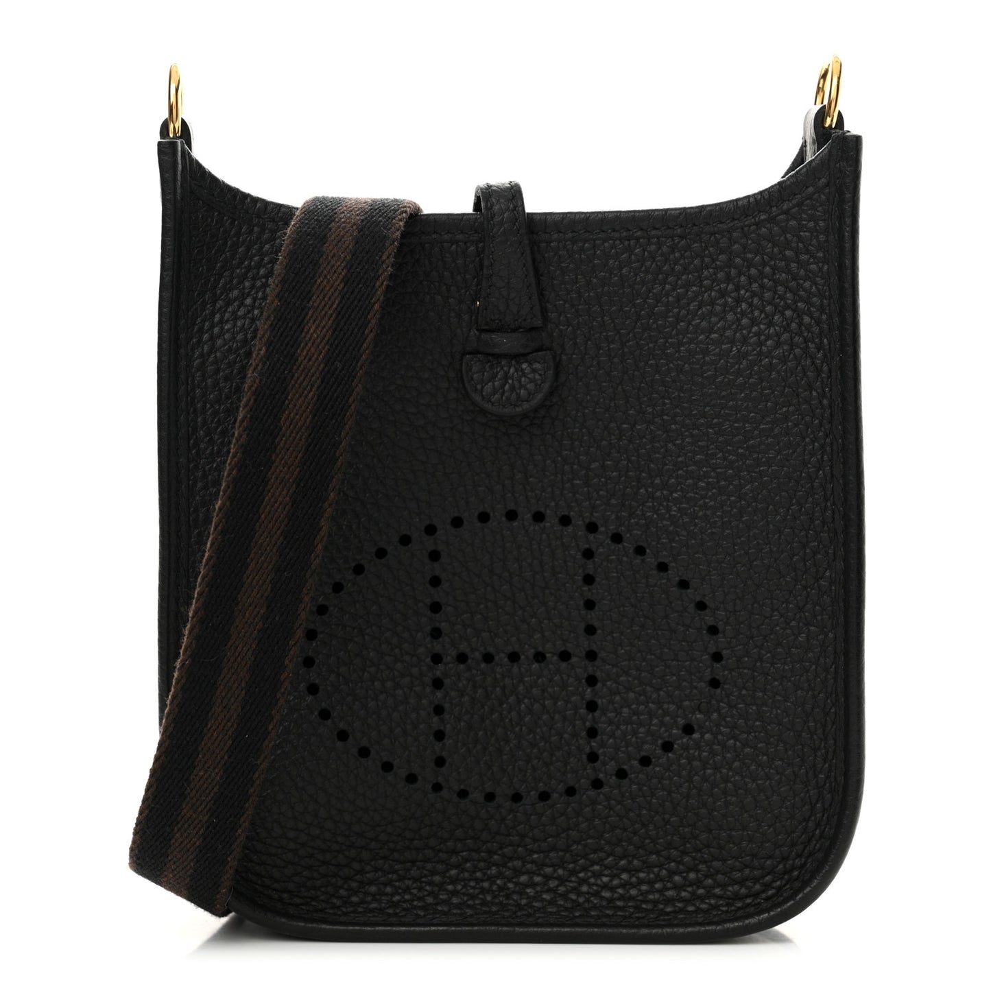 This is an authentic HERMES Taurillon Clemence Amazone Evelyne TPM in Black and Chocolate. This classic small shoulder bag is crafted of clemence calfskin leather in black with a front perforated Hermes "H" oval. The crossbody bag features a black and brown striped canvas shoulder strap with polished gold hardware. The top crossover strap and snap open to an interior of black suede.Follow this item for alerts. Hermes is a registered trademark of Hermes. FASHIONPHILE is not affiliated with Hermes.