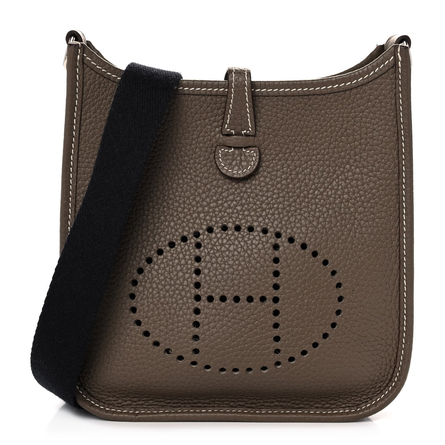 This is an authentic HERMES Taurillon Clemence Amazone Evelyne TPM in Etoupe and Bleu Indigo. This small chic messenger bag is crafted of rich taurillon clemence calfskin leather in taupe brown. The shoulder bag features a dark blue canvas body strap, polished gold hardware, and a perforated Hermes H oval logo. The top of the bag opens with a crossover strap to a matching suede interior.Follow this item for alerts. Hermes is a registered trademark of Hermes. FASHIONPHILE is not affiliated with Hermes.