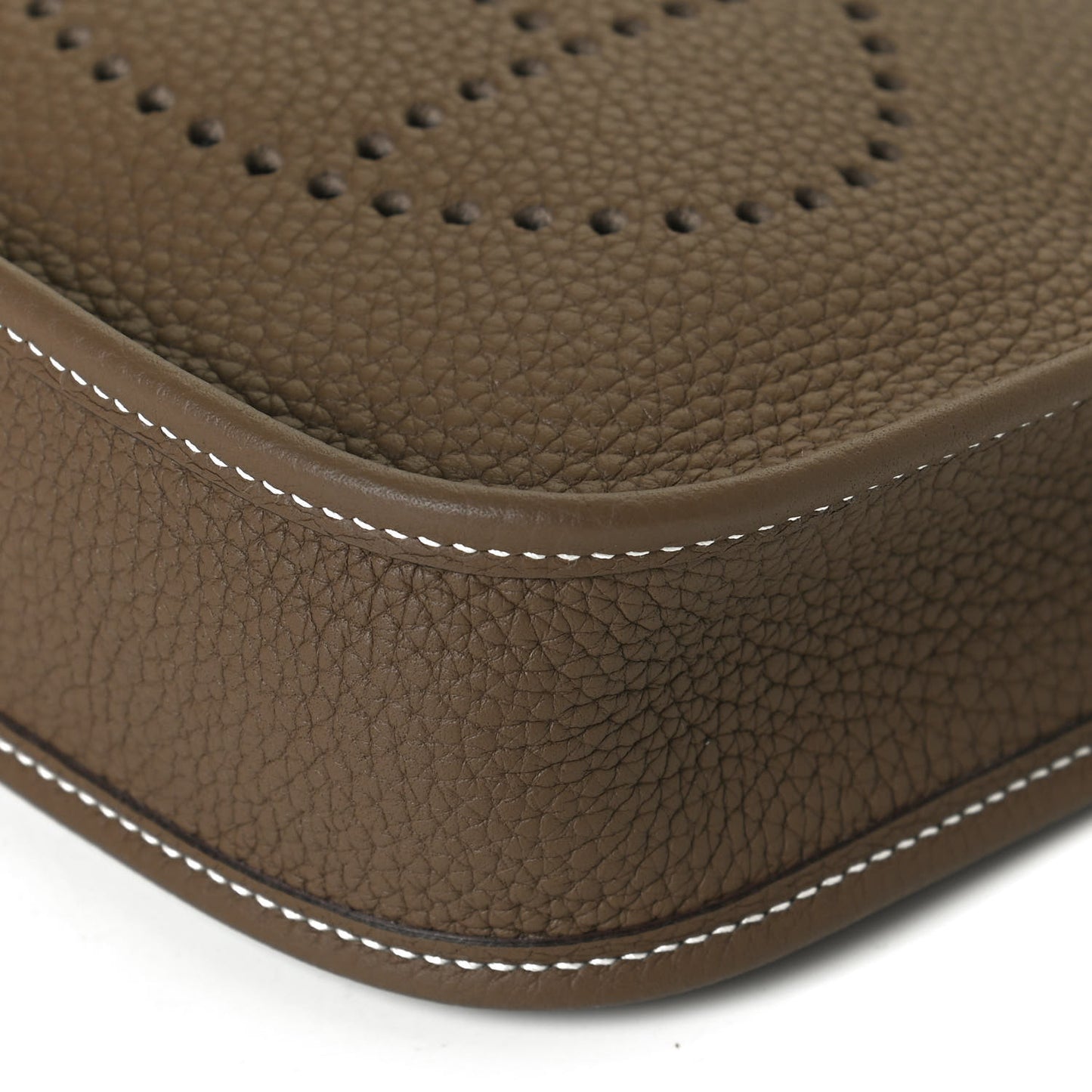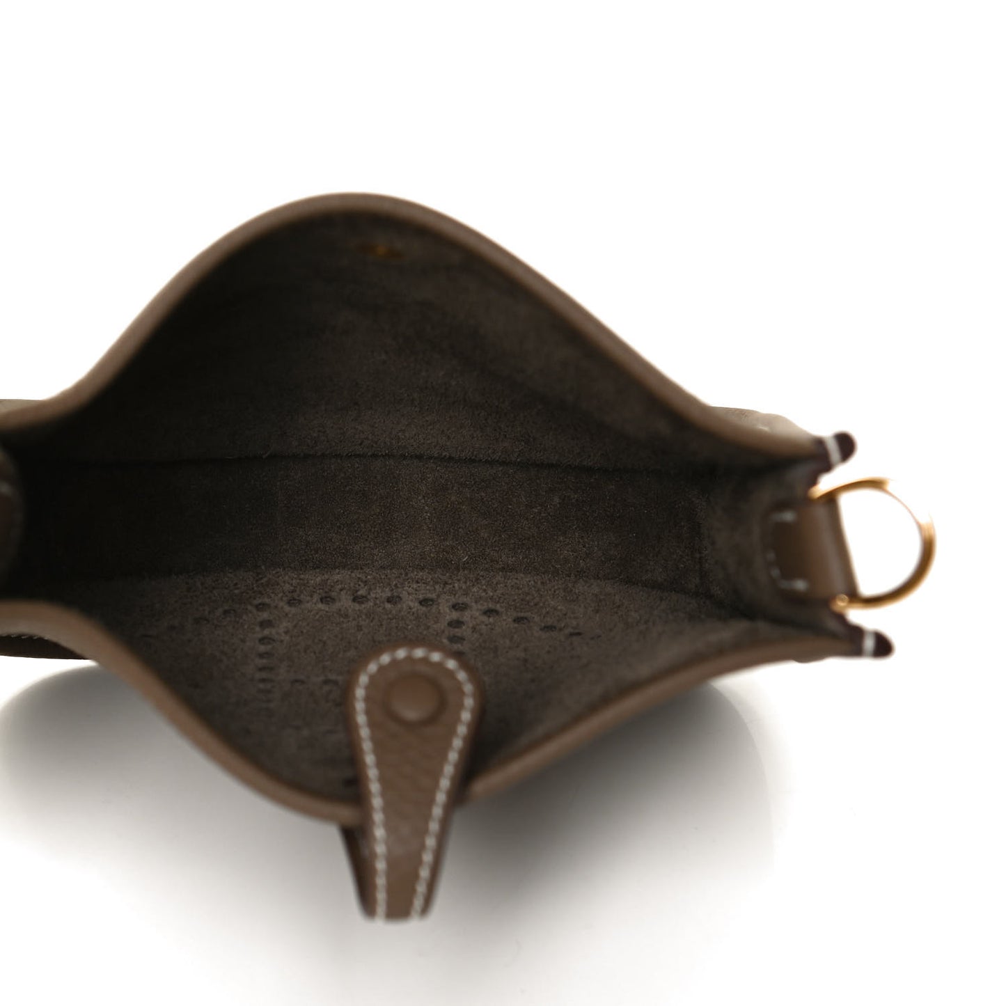 This is an authentic HERMES Taurillon Clemence Amazone Evelyne TPM in Etoupe and Bleu Indigo. This small chic messenger bag is crafted of rich taurillon clemence calfskin leather in brown. The shoulder bag features a dark blue canvas body strap, polished gold hardware, and a perforated Hermes H oval logo. The top of the bag opens with a crossover strap to a matching suede interior.Follow this item for alerts. Hermes is a registered trademark of Hermes. FASHIONPHILE is not affiliated with Hermes.