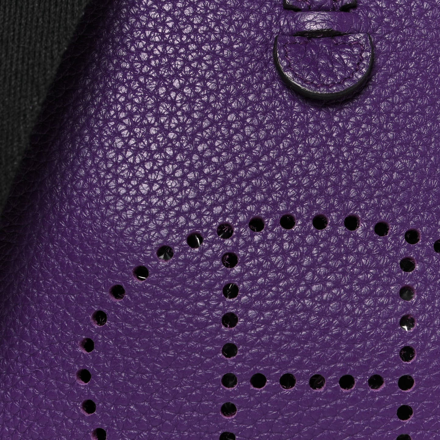 This is an authentic HERMES Taurillon Clemence Amazone Evelyne TPM in Ultraviolet. This stylish messenger bag is crafted of textured calfskin leather in vibrant purple. It features a perforated Hermes H oval logo on the front and a dark blue canvas crossbody strap with palladium hardware. The top opens with a crossover strap to a purple suede interior. This is a perfect messenger bag, ideal for everyday essentials, from Hermes!Follow this item for alerts. Hermes is a registered trademark of Hermes. FASHIONPHILE is not affiliated with Hermes.