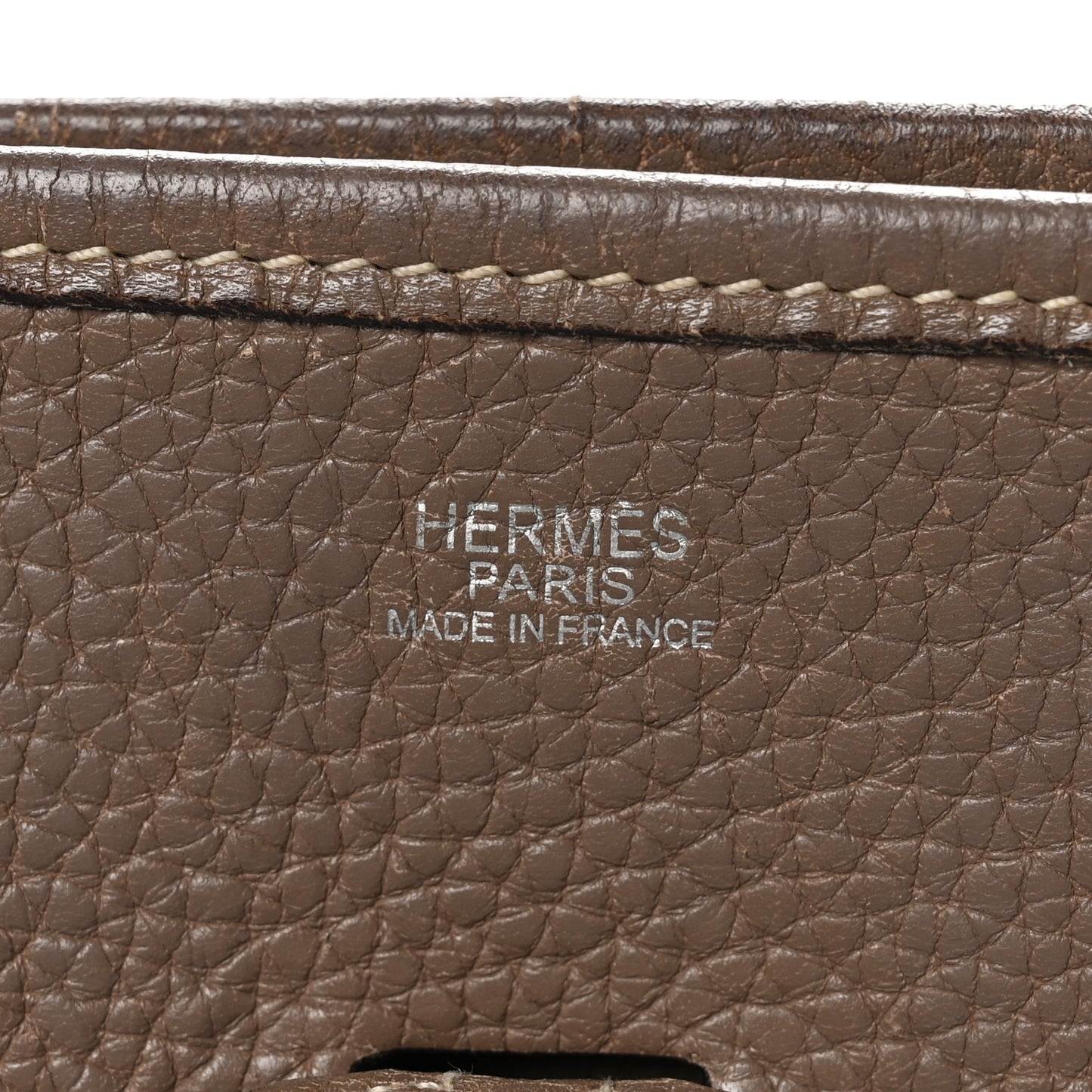This is an authentic HERMES Taurillon Clemence Evelyne II PM in Etoupe. This crossbody messenger bag is crafted of clemence pebbled calfskin leather in taupe. This popular shoulder bag features a canvas shoulder strap, an external flat pocket, silver palladium hardware, and a perforated Hermes H oval on the front. The top of the bag opens with a cross over strap to a matching suede interior.Follow this item for alerts. Hermes is a registered trademark of Hermes. FASHIONPHILE is not affiliated with Hermes.