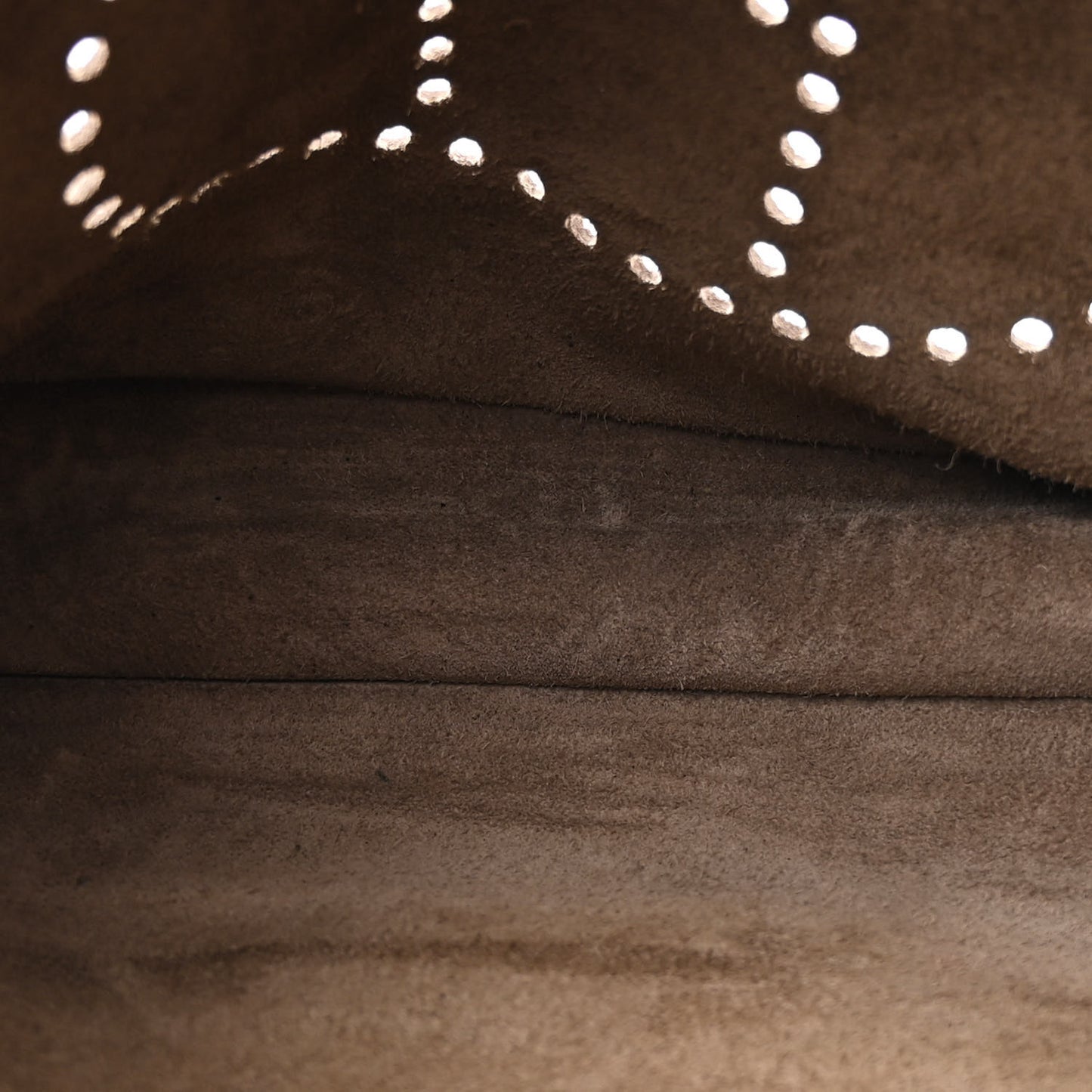 This is an authentic HERMES Taurillon Clemence Evelyne III PM in Etoupe. This bag is crafted of taupe calfskin leather. The bag features an adjustable fabric shoulder strap, an exterior flat pocket, a perforated H logo on the front, and a crossover strap with palladium silver hardware. The top opens to a matching suede interior.