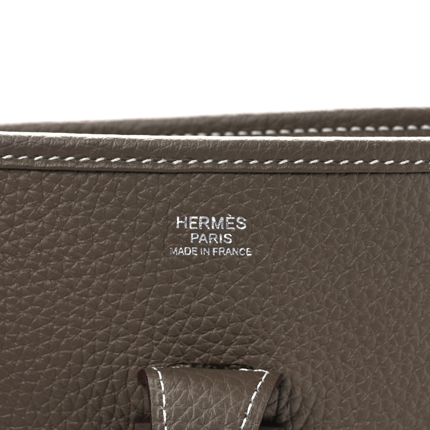 This is an authentic HERMES Taurillon Clemence Evelyne III PM in Etoupe. This cross-body messenger bag is crafted of Clemence pebbled calfskin leather in taupe brown. This popular shoulder bag features an adjustable canvas shoulder strap, a rear pocket, permabrass gold hardware and a perforated oval Hermes H on the front. The top of the bag opens with a cross-over strap to a brown suede interior.Follow this item for alerts. Hermes is a registered trademark of Hermes. FASHIONPHILE is not affiliated with Hermes.