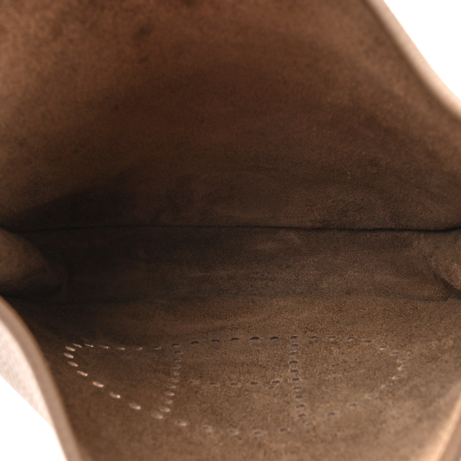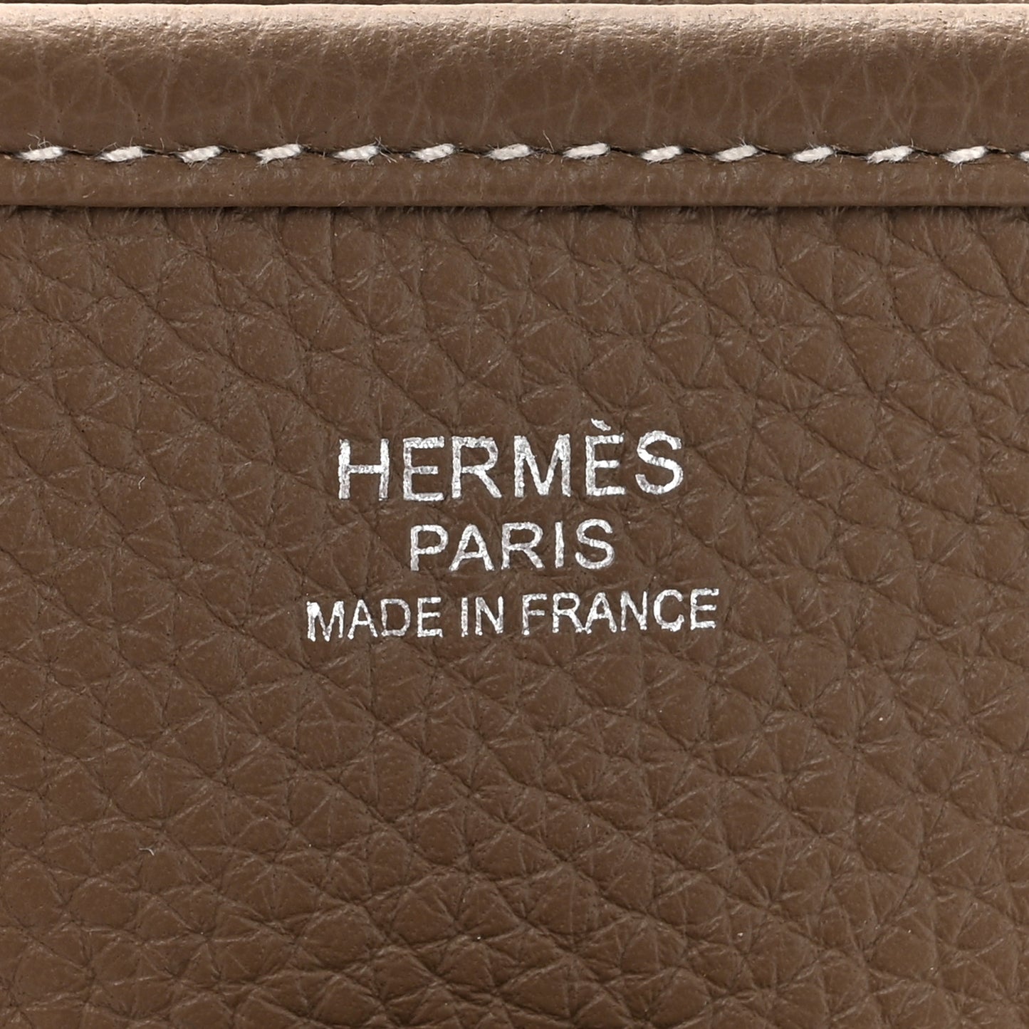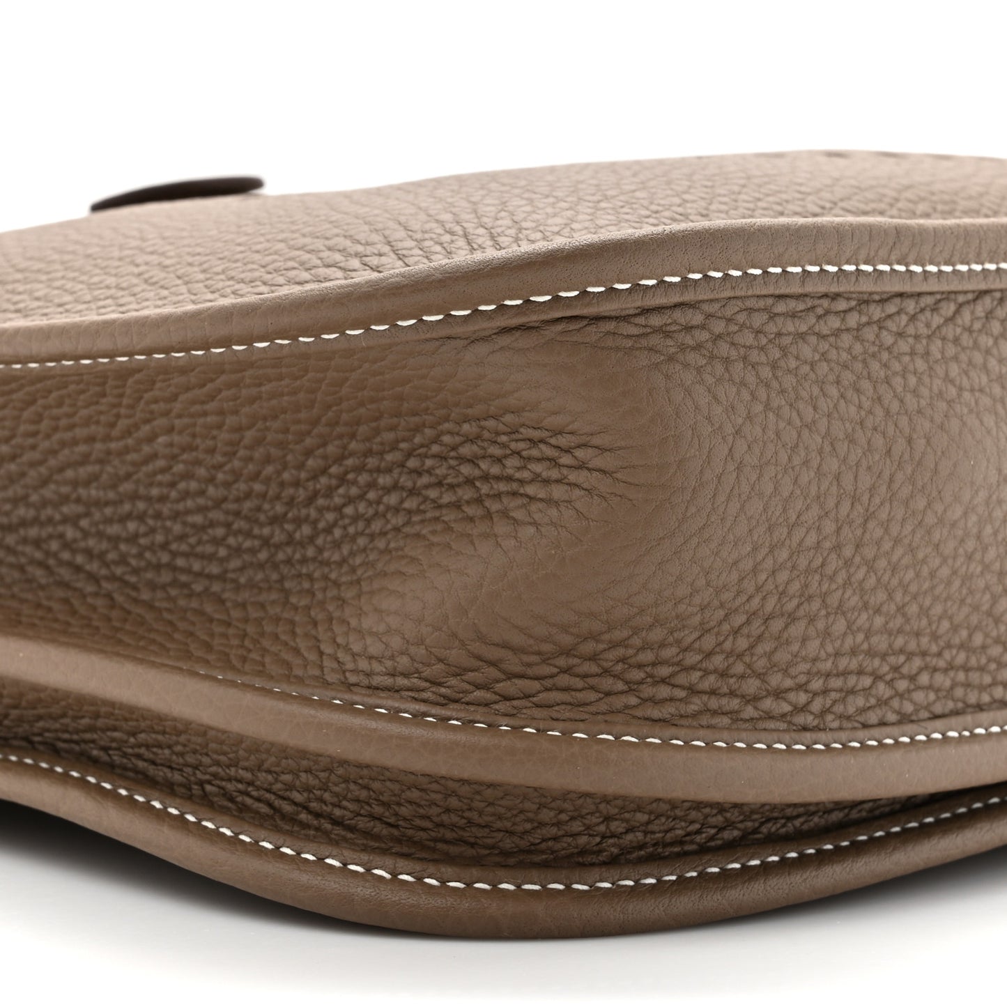This is an authentic HERMES Taurillon Clemence Evelyne III PM in Etoupe. This cross-body messenger bag is crafted of Clemence pebbled calfskin leather in taupe brown. This popular shoulder bag features an adjustable canvas shoulder strap, a rear pocket, polished gold hardware, and a perforated oval Hermes H on the front. The top of the bag opens with a cross-over strap to a beige suede interior.Follow this item for alerts. Hermes is a registered trademark of Hermes. FASHIONPHILE is not affiliated with Hermes.