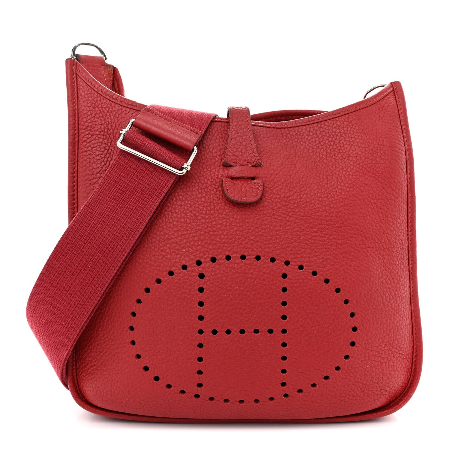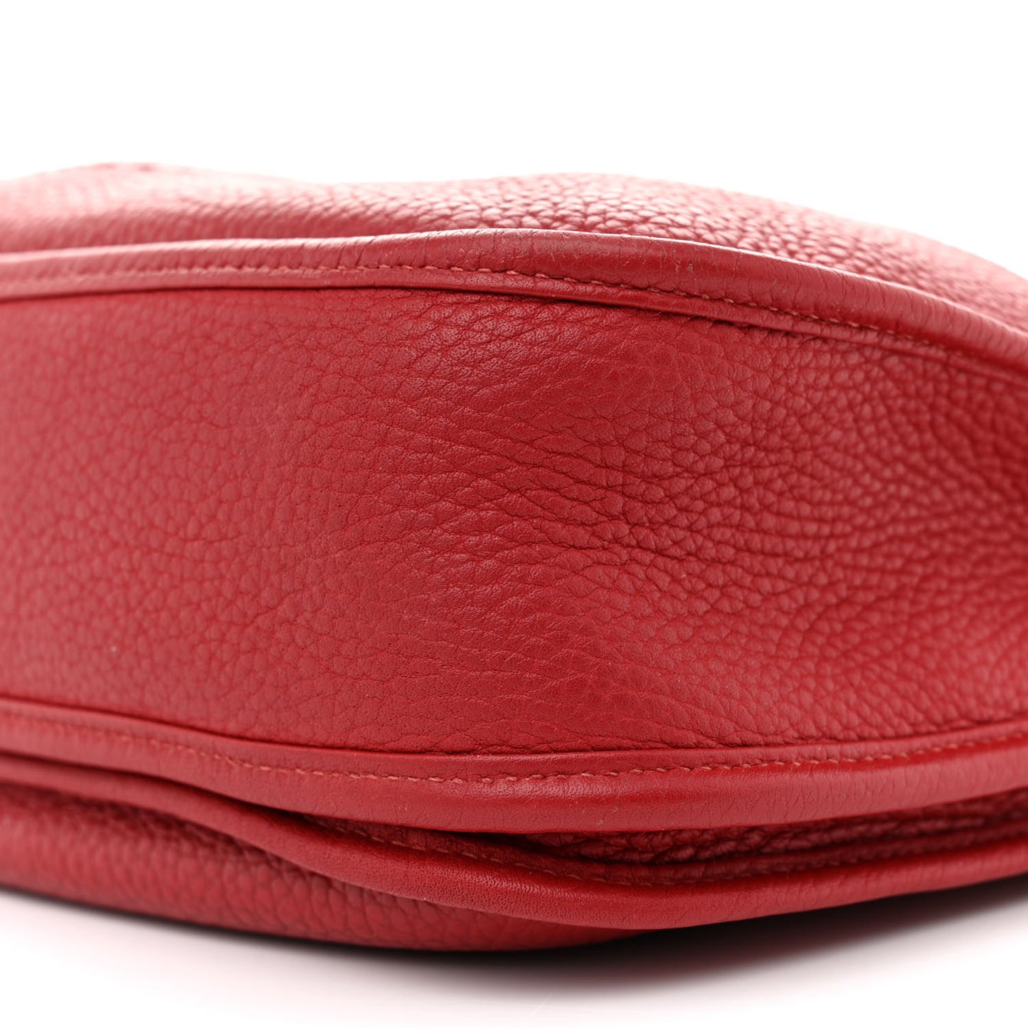 This is an authentic HERMES Taurillon Clemence Evelyne III PM in Rubis. This stylish smaller sized cross-body bag is finely crafted of Clemence calfskin leather in deep red. It features a leather cross-body strap, a frontal perforated Hermes H and palladium silver hardware including clasps for the shoulder strap. The top is open to a matching suede interior.Follow this item for alerts. Hermes is a registered trademark of Hermes. FASHIONPHILE is not affiliated with Hermes.