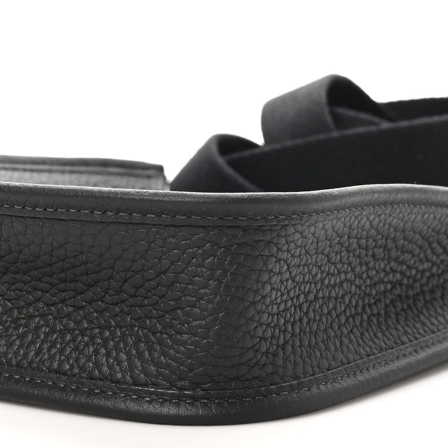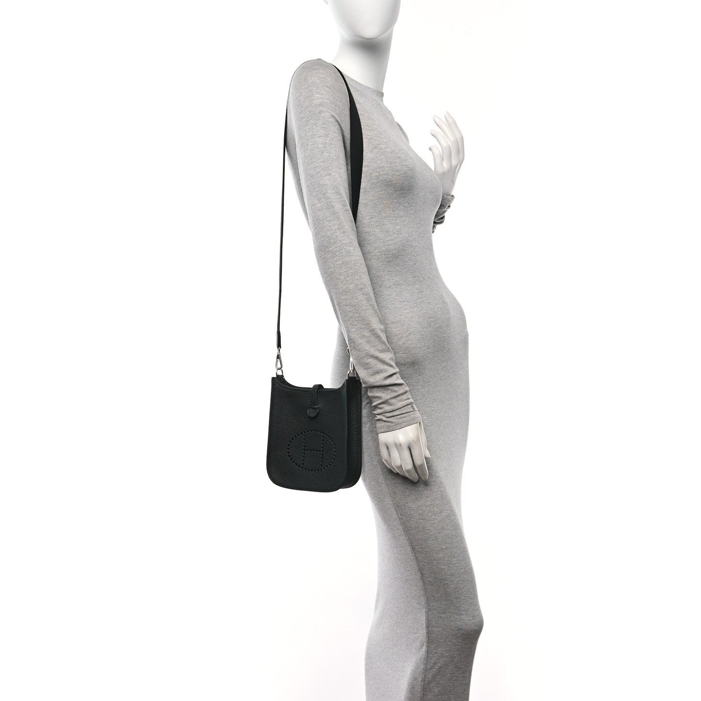 This is an authentic HERMES Taurillon Clemence Evelyne TPM in Black. This classic small shoulder bag is crafted of clemence calfskin leather in black with a front perforated Hermes "H" oval. The crossbody bag features a black canvas shoulder strap with polished palladium hardware. The top crossover strap and snap open to an interior of black suede.Follow this item for alerts. Hermes is a registered trademark of Hermes. FASHIONPHILE is not affiliated with Hermes.