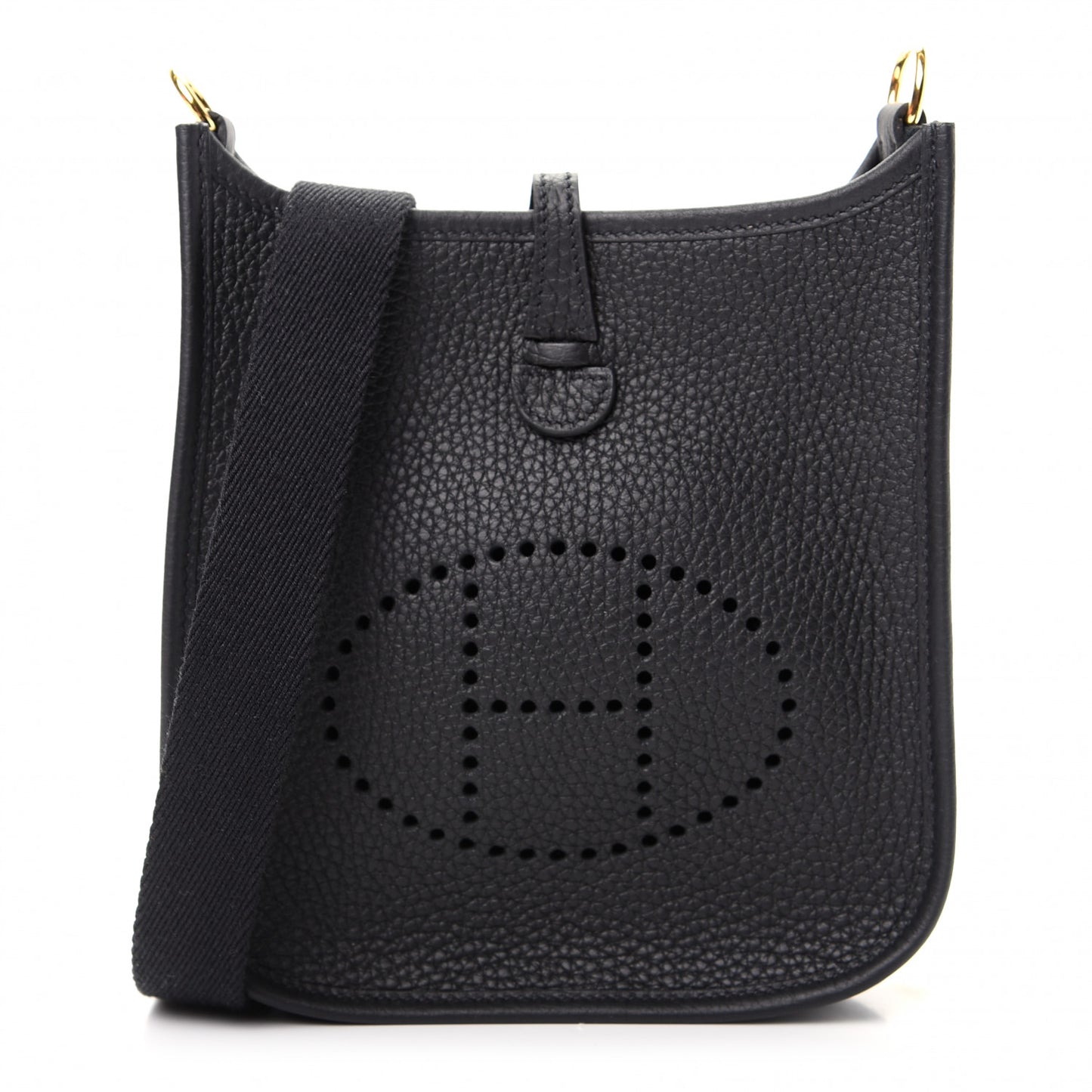 This is an authentic HERMES Taurillon Clemence Evelyne TPM in Black. This classic small shoulder bag is crafted of clemence calfskin leather in black with a front perforated Hermes "H" oval. The crossbody bag features a black canvas shoulder strap with polished gold hardware. The top crossover strap and snap open to an interior of black suede.Follow this item for alerts. Hermes is a registered trademark of Hermes. FASHIONPHILE is not affiliated with Hermes.
