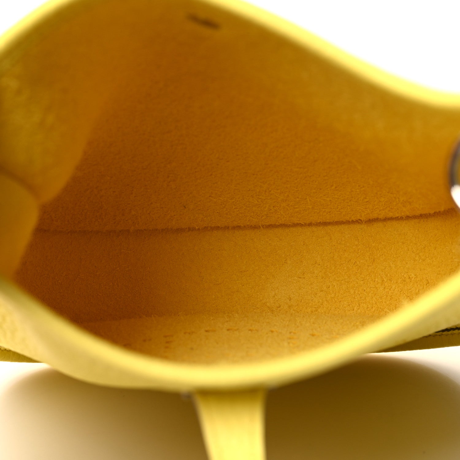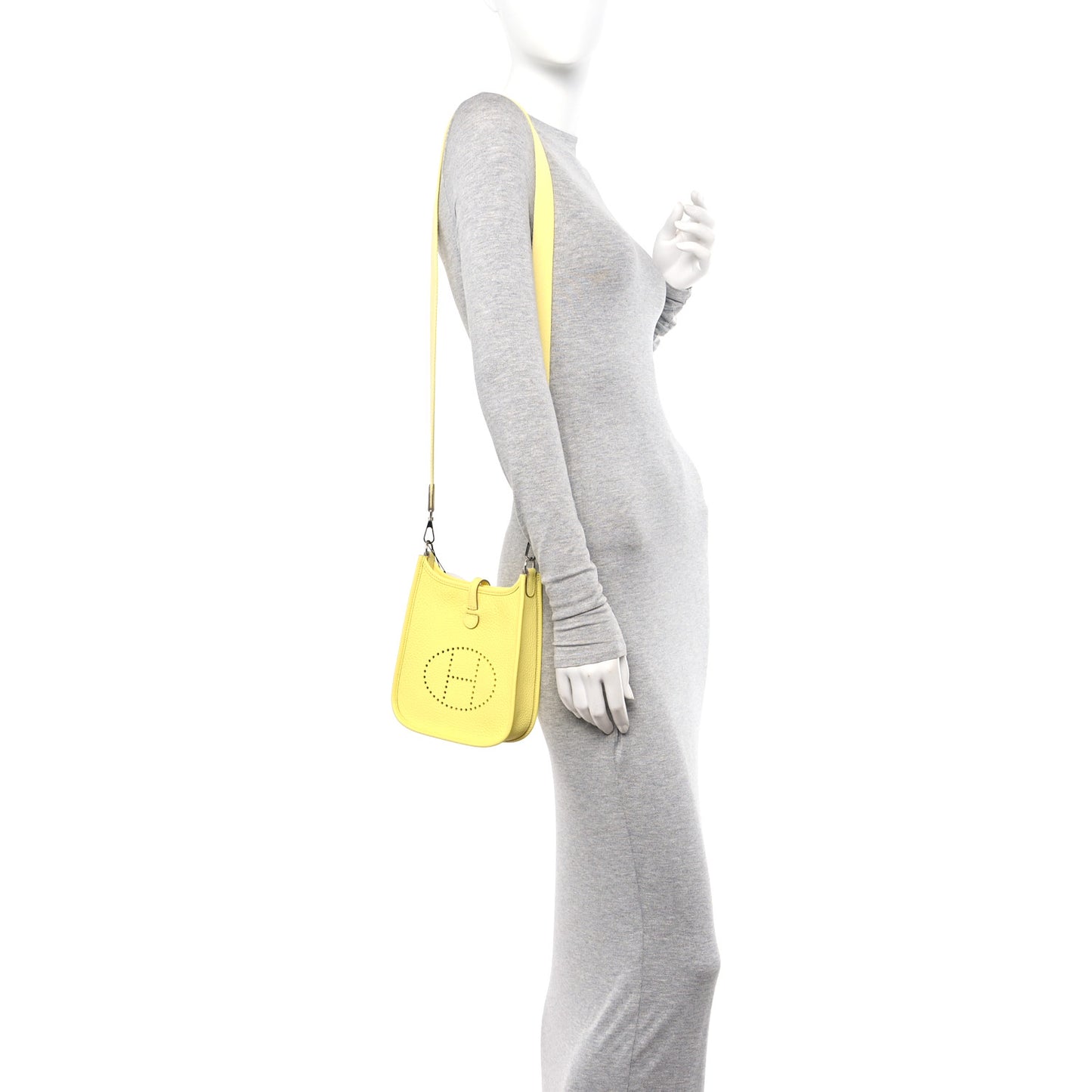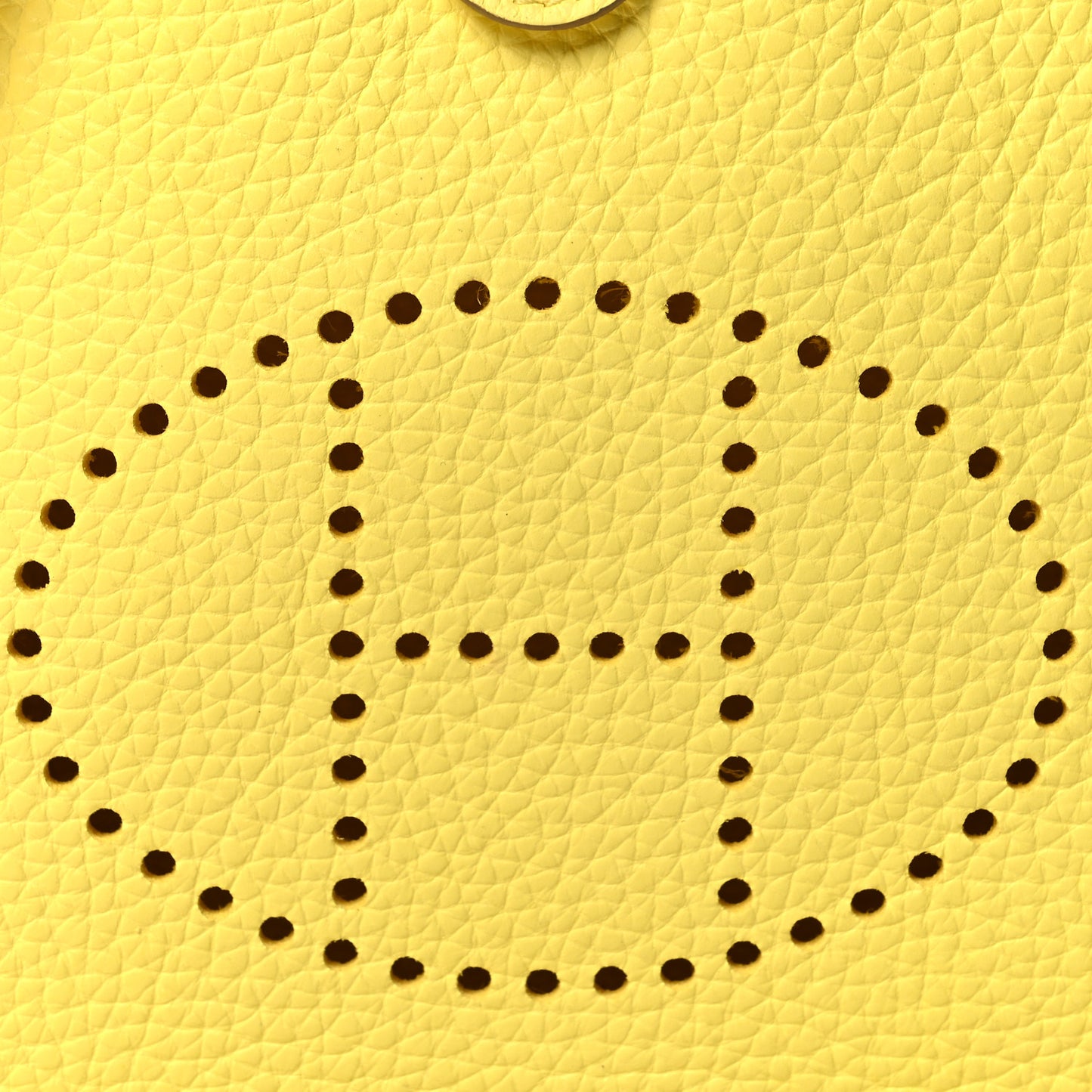 This is an authentic HERMES Taurillon Clemence Evelyne TPM in Limoncello. This stylish small messenger bag is crafted of textured Taurillon Clemence calfskin leather in yellow. It features a perforated Hermes H oval, a canvas crossbody strap, and palladium hardware. The top of the bag opens with a crossover strap to a matching suede interior.Follow this item for alerts. Hermes is a registered trademark of Hermes. FASHIONPHILE is not affiliated with Hermes.