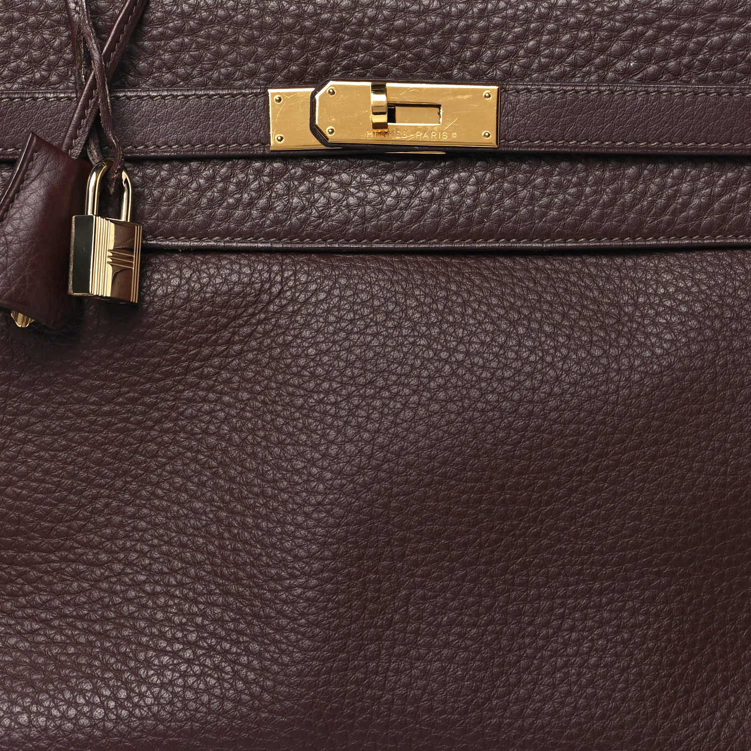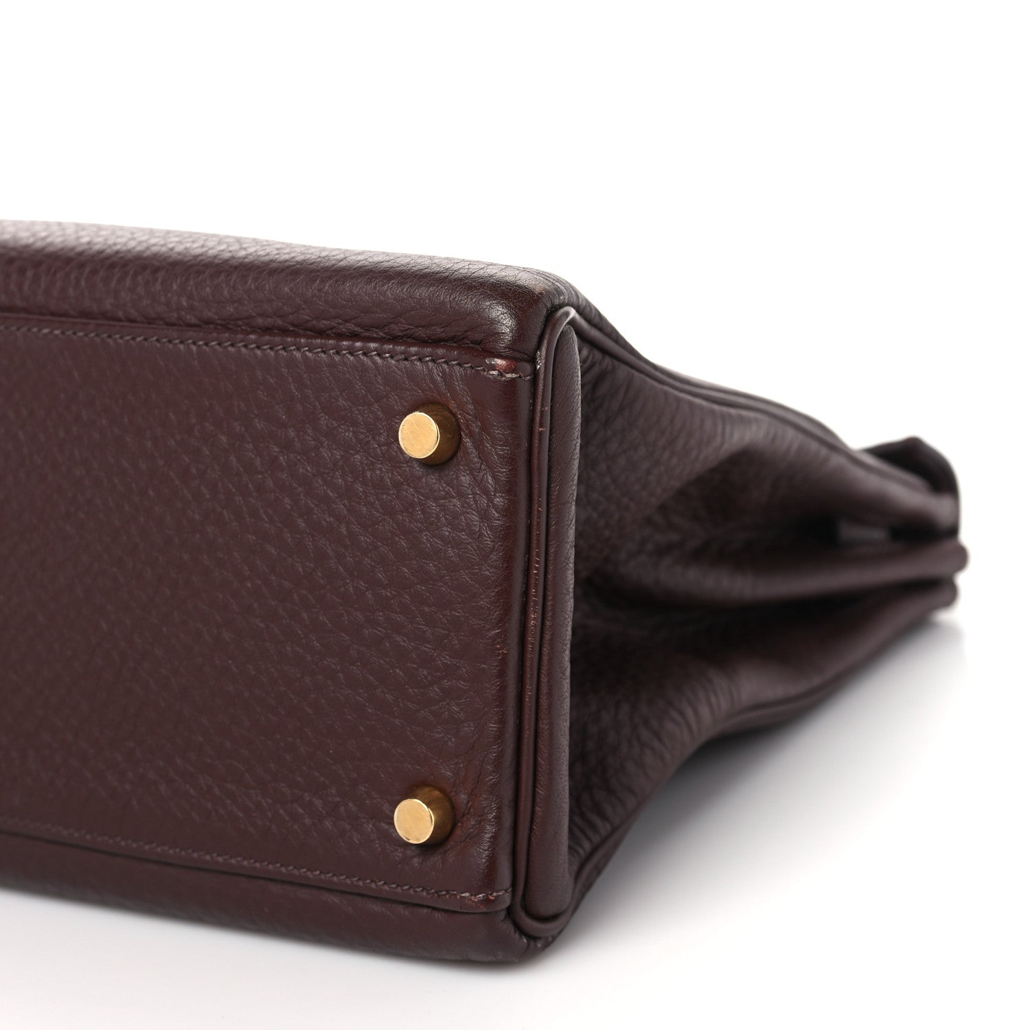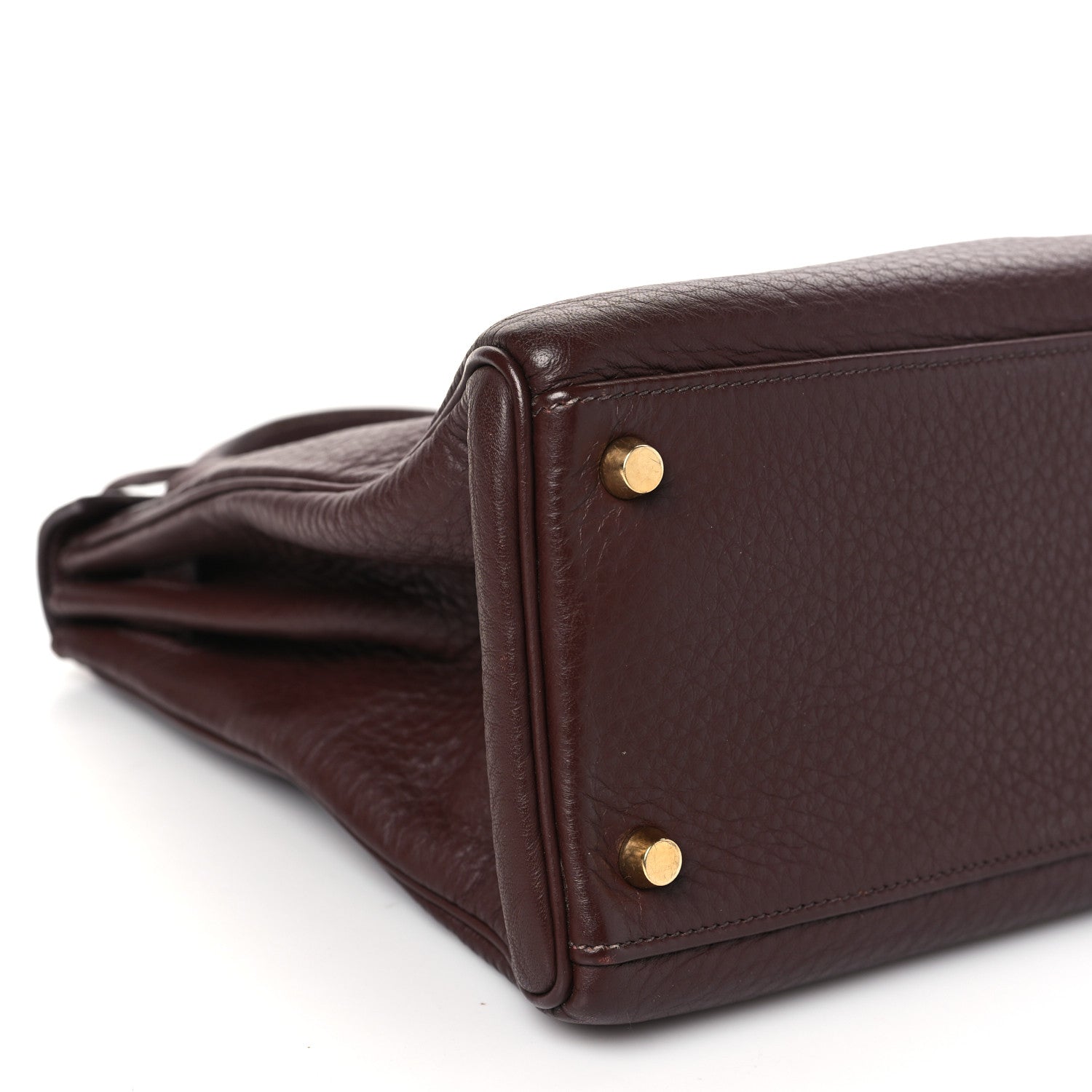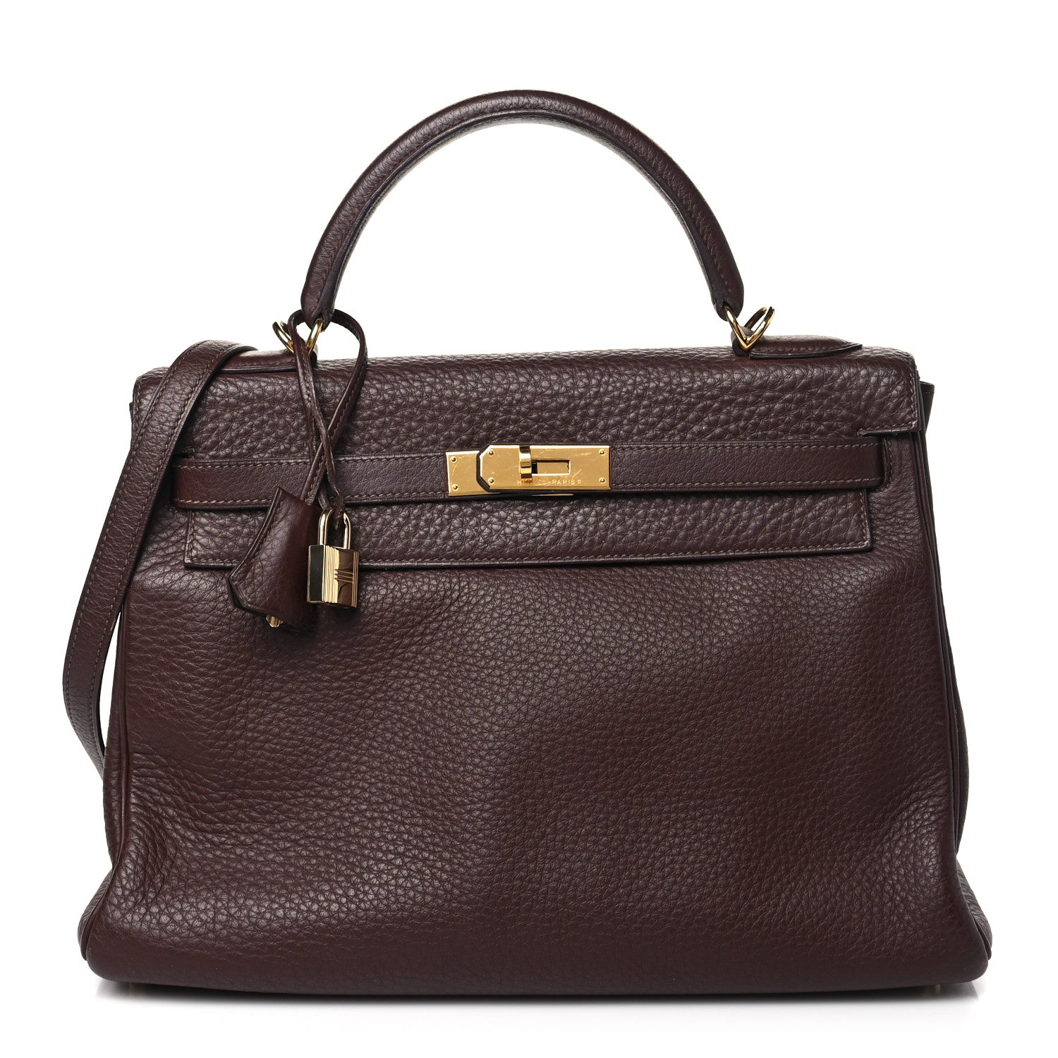 This is an authentic Hermes Taurillon Clemence Kelly Retourne 32 in Havane. This handbag is crafted with brown textured calfskin leather. It features a leather clasp top handle, a cross-over flap with strap closure, and a signature gold-plated turn lock with a padlock and a hanging clochette with keys. It opens to a matching calfskin leather interior.Follow this item for alerts. Hermes is a registered trademark of Hermes. FASHIONPHILE is not affiliated with Hermes.
