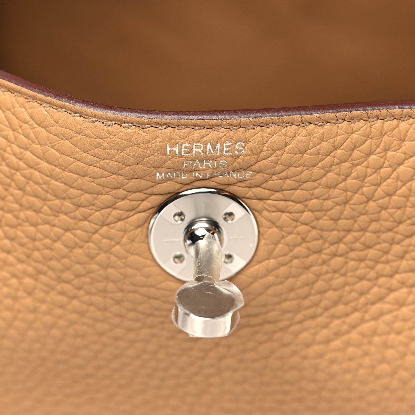 This is an authentic HERMES Taurillon Clemence Mini Lindy 20 in Biscuit. This stylish mini shoulder bag is beautifully crafted of textured calfskin leather in light brown. The bag features rolled leather top handles and a looping shoulder strap with polished palladium hardware. The top zippers open to a smooth leather interior with patch pockets.Follow this item for alerts. Hermes is a registered trademark of Hermes. FASHIONPHILE is not affiliated with Hermes.
