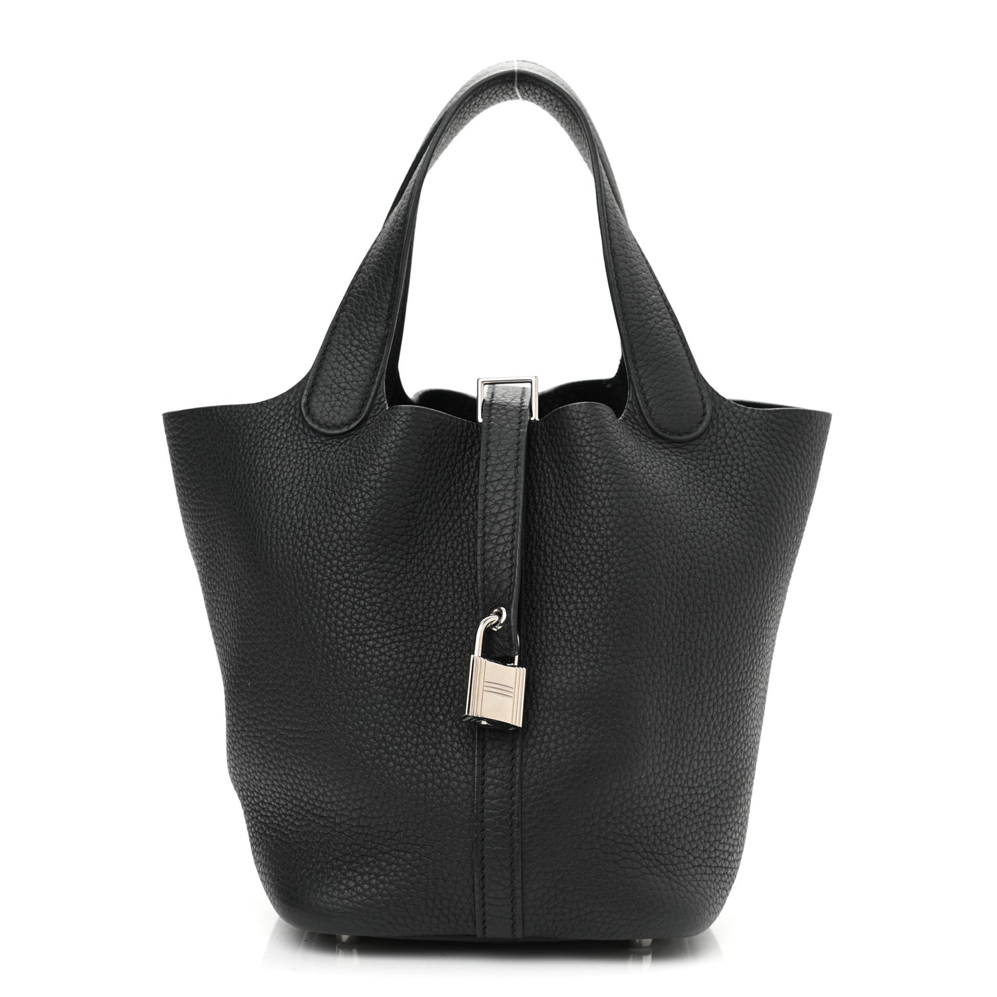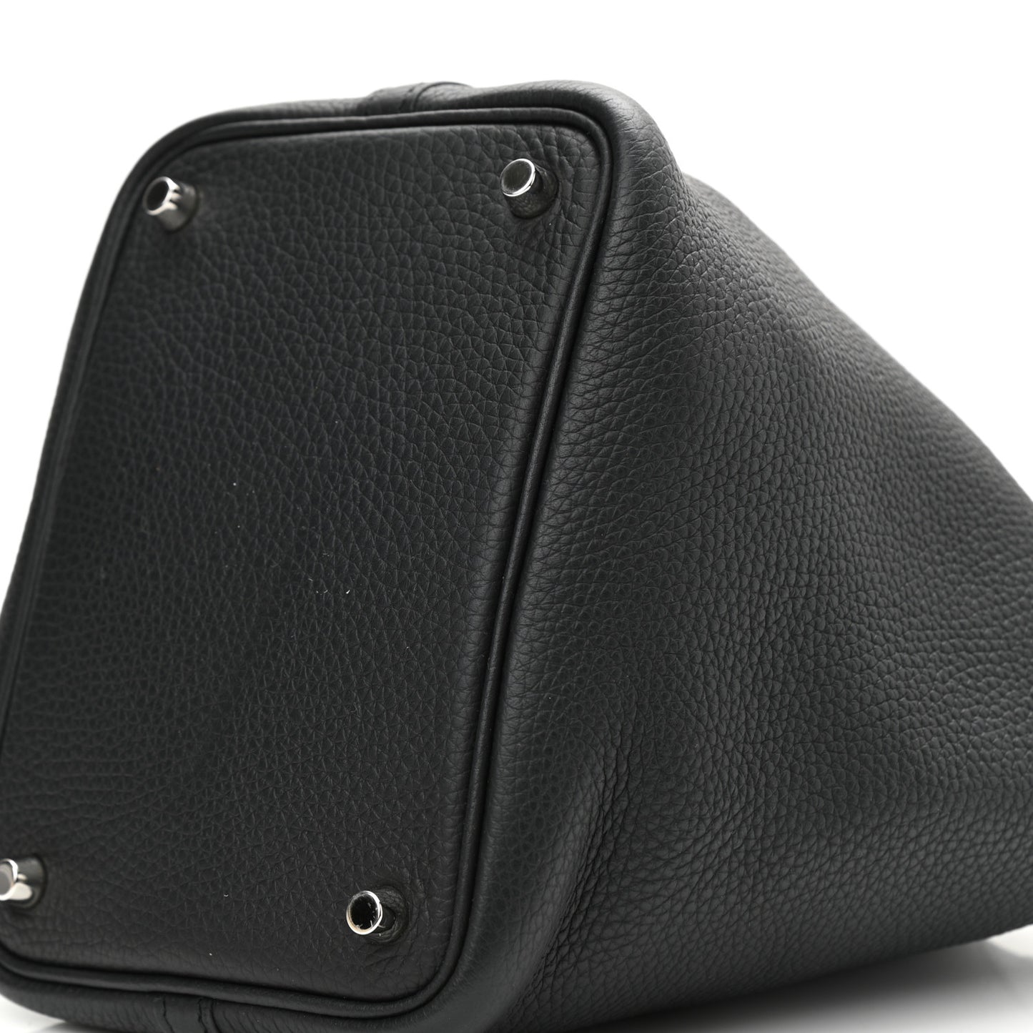 This is an authentic HERMES Taurillon Clemence Picotin Lock 18 PM in Black. This tote is crafted of soft taurillon clemence calfskin leather in black with palladium silver plated hardware. This tote is a one-piece handbag with strap handles that extend from the sides with an extra layer of leather for support. The bag opens to a matching black suede interior.Follow this item for alerts. Hermes is a registered trademark of Hermes. FASHIONPHILE is not affiliated with Hermes.