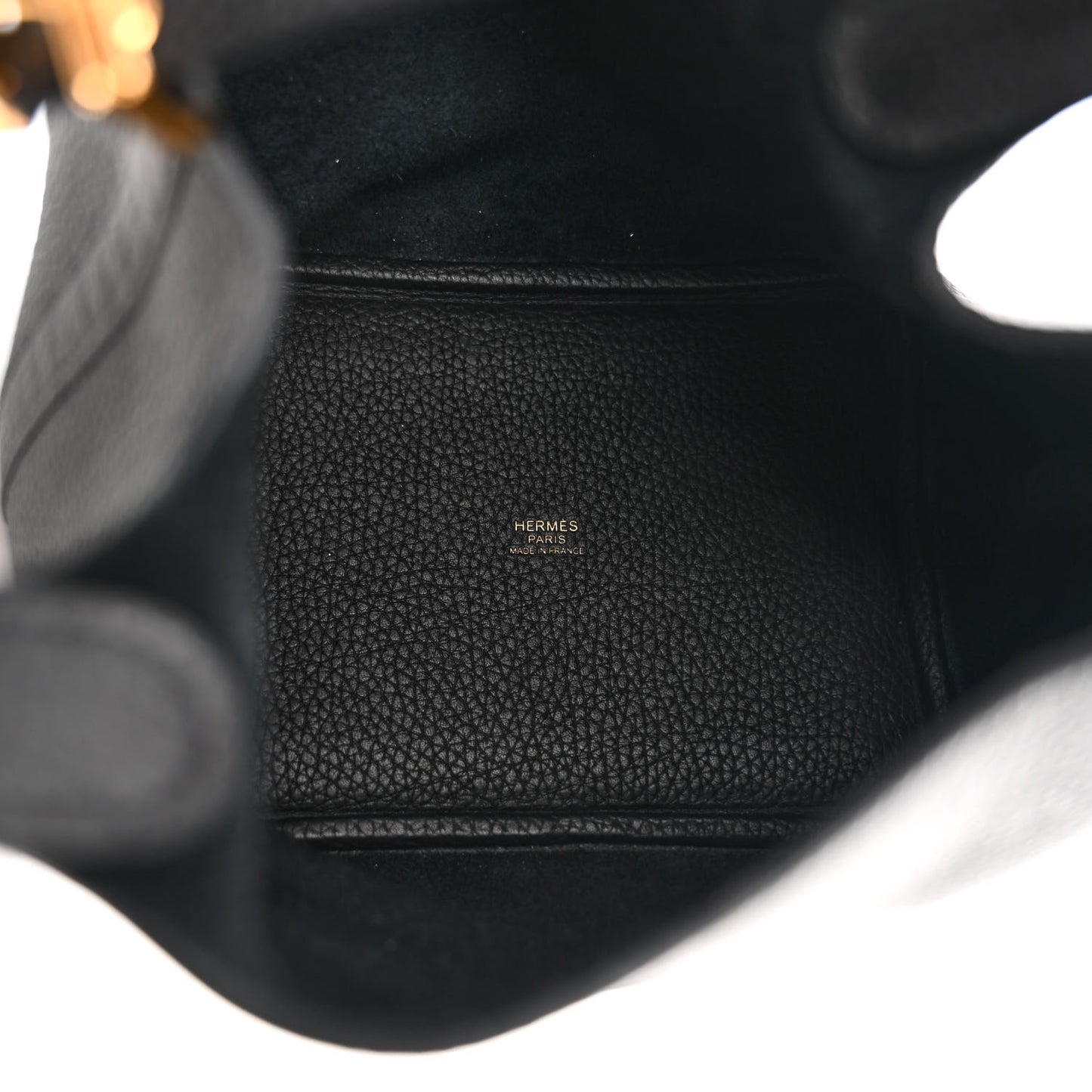 This is an authentic HERMES Taurillon Clemence Picotin Lock 18 PM in Black. This tote is crafted of soft taurillon clemence calfskin leather in black with polished gold plated hardware. This tote is a one-piece handbag with strap handles that extend from the sides with an extra layer of leather for support. The bag opens to a matching black suede interior.Follow this item for alerts. Hermes is a registered trademark of Hermes. FASHIONPHILE is not affiliated with Hermes.