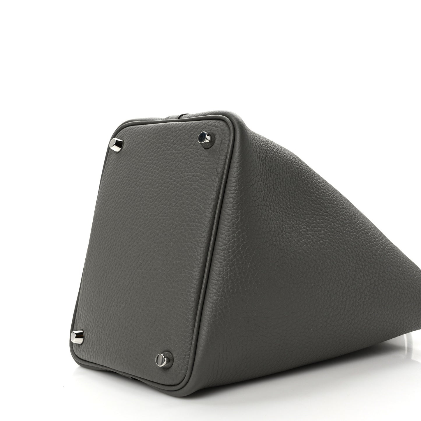 This is an authentic HERMES Taurillon Clemence Picotin Lock 18 PM in Gris Meyer. This chic tote is crafted of soft taurillon clemence calfskin leather in grey. This bucket style bag features a unique one-piece reinforced design with leather top handles and a closure strap that can be secured by a polished silver padlock. The top is open to a spacious suede interior.Follow this item for alerts. Hermes is a registered trademark of Hermes. FASHIONPHILE is not affiliated with Hermes.