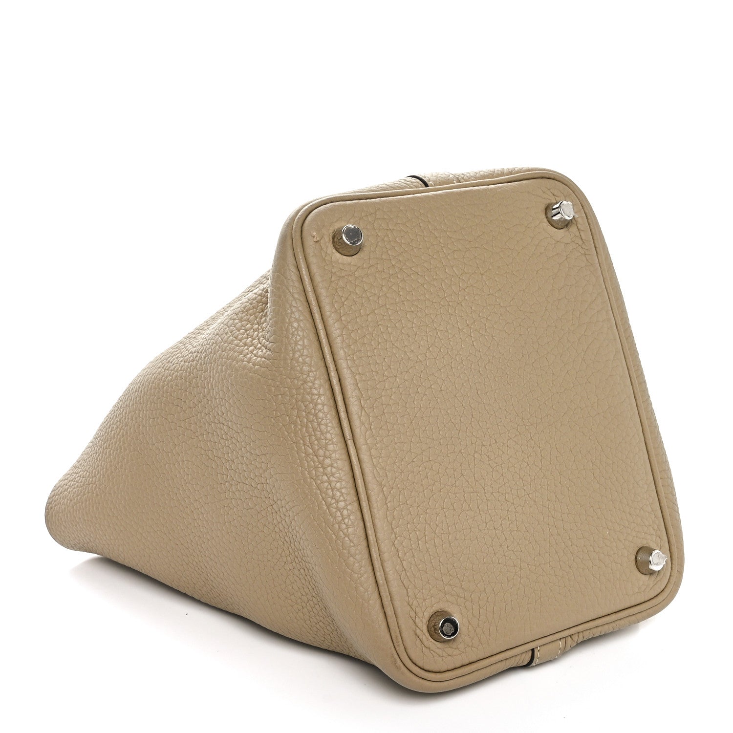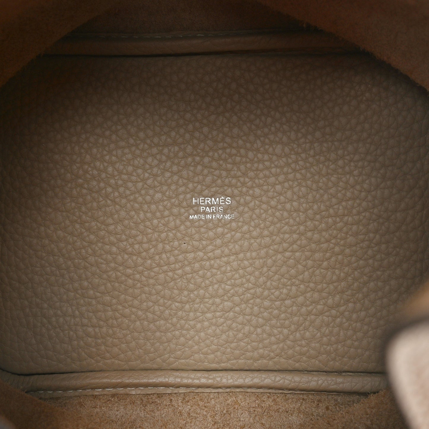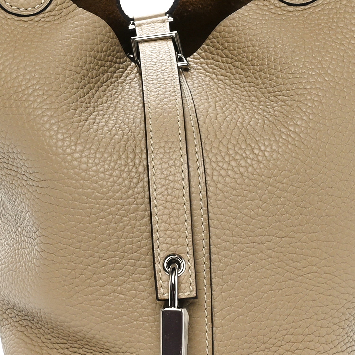 This is an authentic HERMES Taurillon Clemence Picotin Lock 18 PM in Trench. This chic tote is crafted of textured calfskin leather in beige. This bucket-style bag features a unique one-piece reinforced design with leather top handles and a closure strap that is secured by a polished palladium padlock. This opens to a spacious beige suede interior with a leather base.Follow this item for alerts. Hermes is a registered trademark of Hermes. FASHIONPHILE is not affiliated with Hermes.