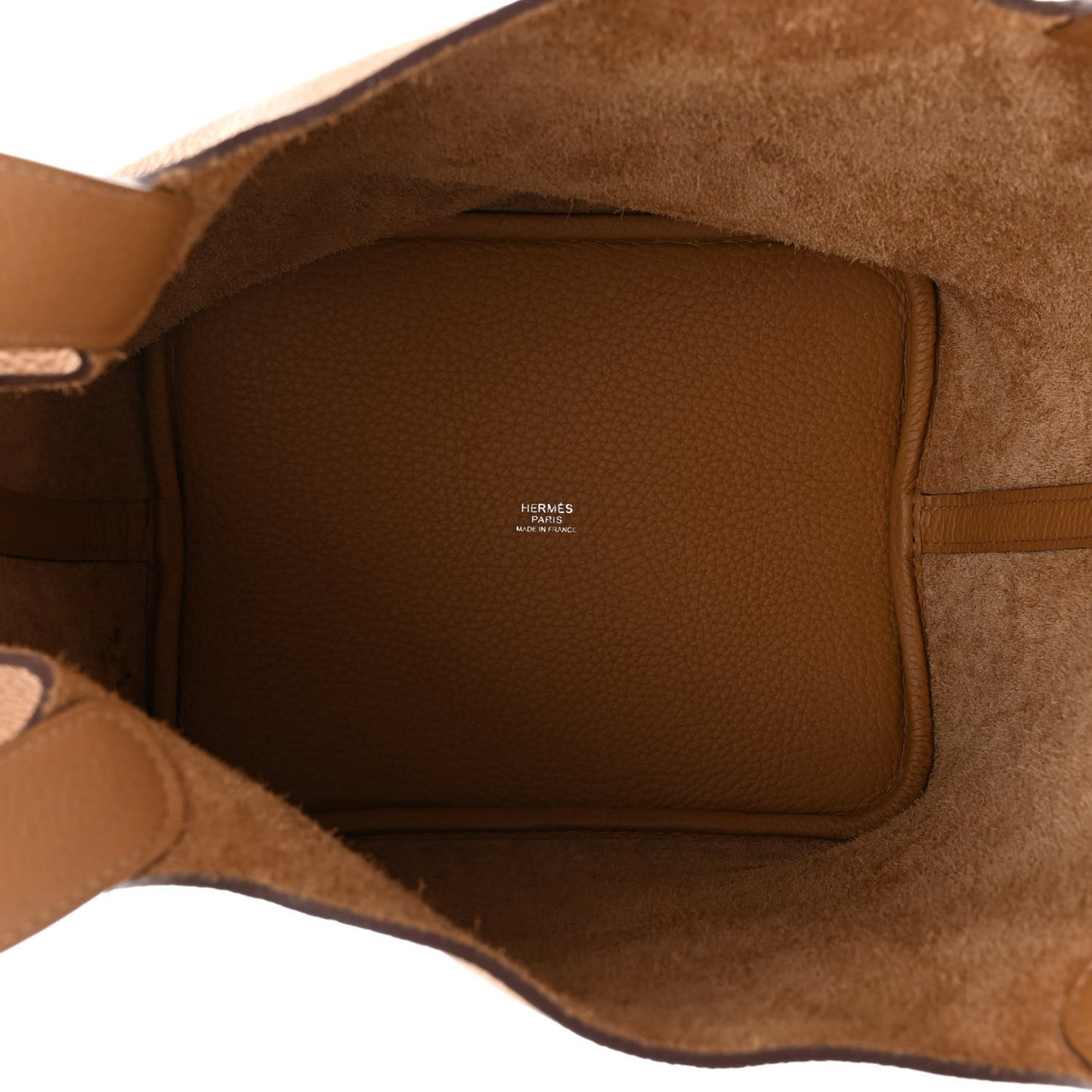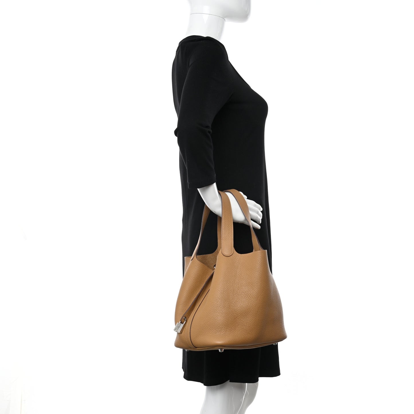 This is an authentic HERMES Taurillon Clemence Picotin Lock 22 MM in Biscuit. This stunning tote is crafted of luxuriously soft clemence calfskin leather in brown. This bag features a unique one piece reinforced design with leather top handles and a closure strap that can be secured by a silver padlock. This opens to a spacious suede interior with a leather base.Follow this item for alerts. Hermes is a registered trademark of Hermes. FASHIONPHILE is not affiliated with Hermes.