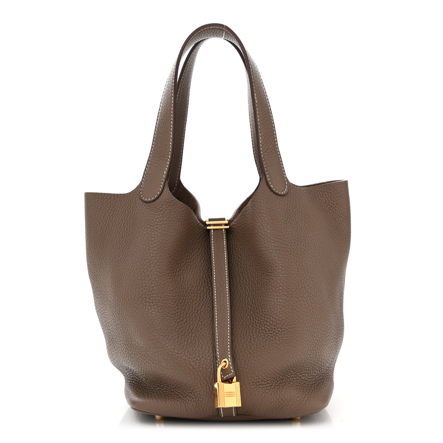 This is an authentic HERMES Taurillon Clemence Picotin Lock 22 MM in Etoupe. This stunning tote is crafted of luxuriously soft Clemence calfskin leather in taupe, in a relaxed bucket style, with gold plated hardware. The bag features a unique one-piece reinforced design with leather top handles and a thin cross-over strap. The top is open to a matching suede interior.Follow this item for alerts. Hermes is a registered trademark of Hermes. FASHIONPHILE is not affiliated with Hermes.