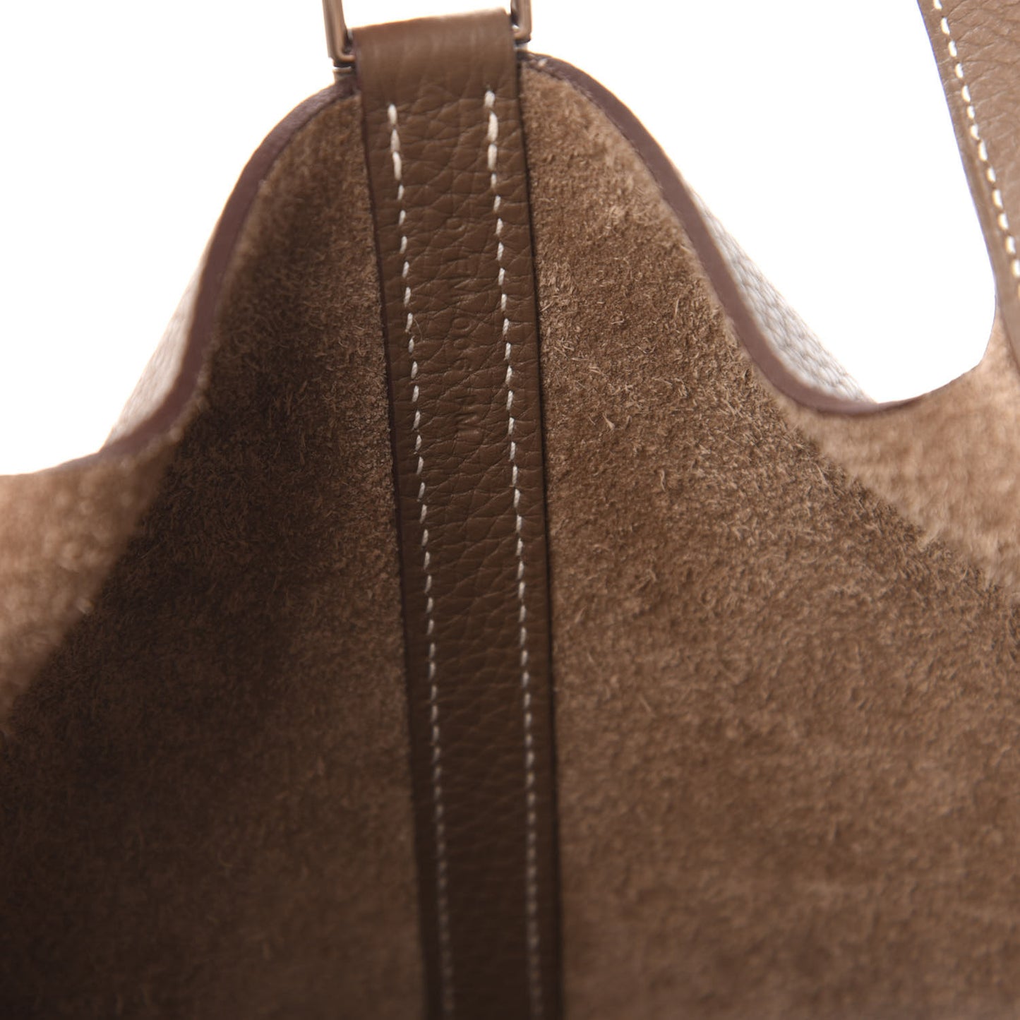 This is an authentic HERMES Taurillon Clemence Picotin Lock 22 MM in Etoupe. This stunning tote is crafted of luxuriously soft clemence calfskin leather in taupe, in a relaxed bucket style, featuring silver hardware. The bag features a unique one piece reinforced design with leather top handles and a thin cross over strap. The top is open to a matching suede interior.