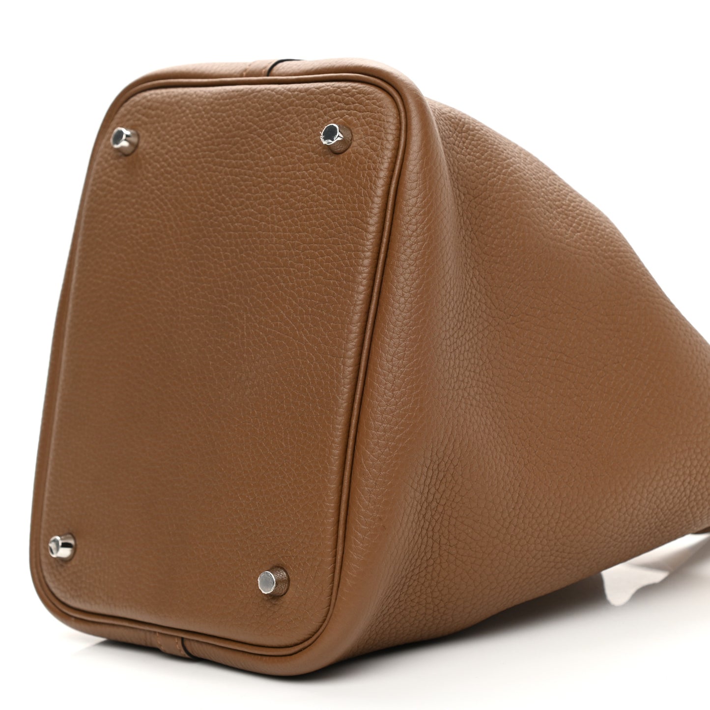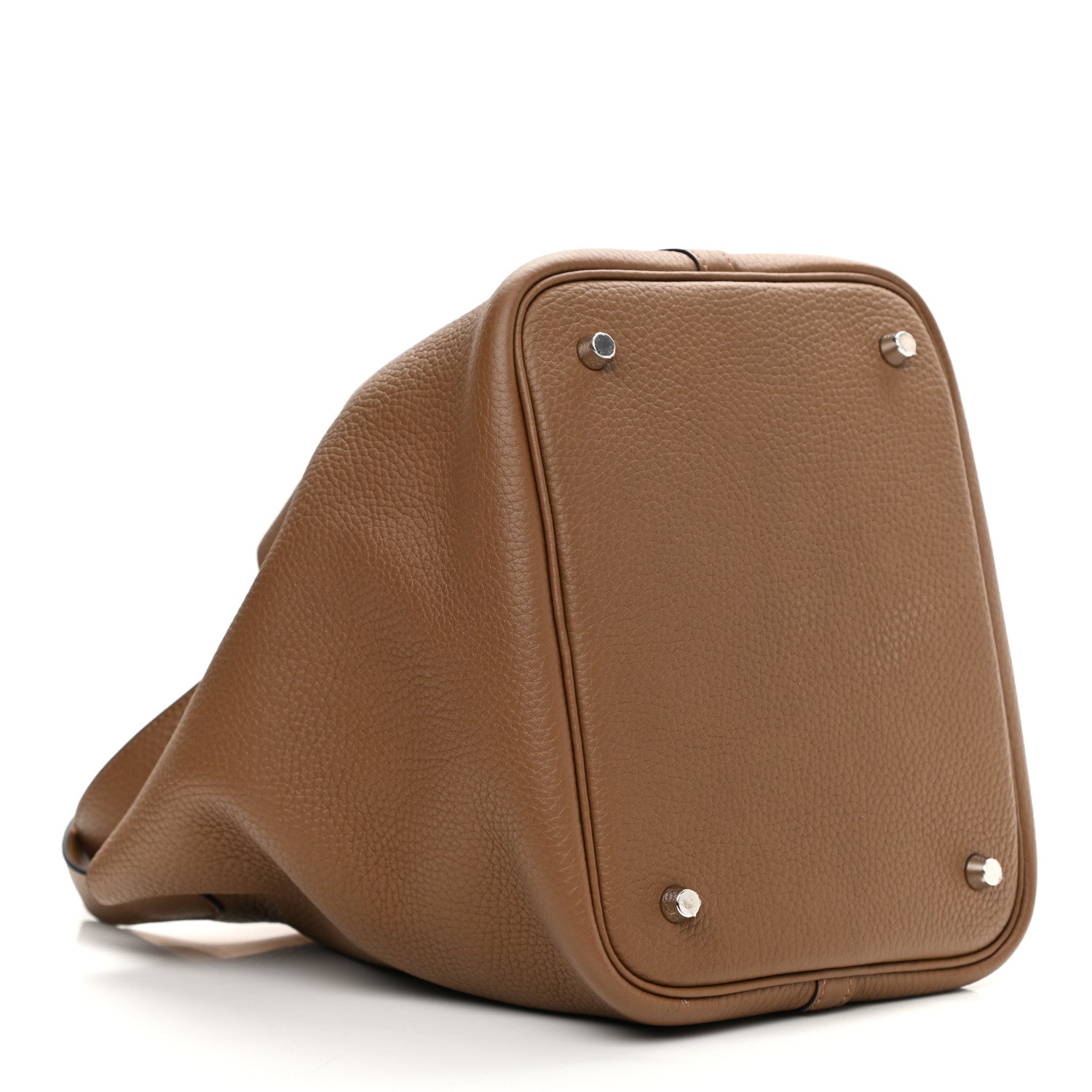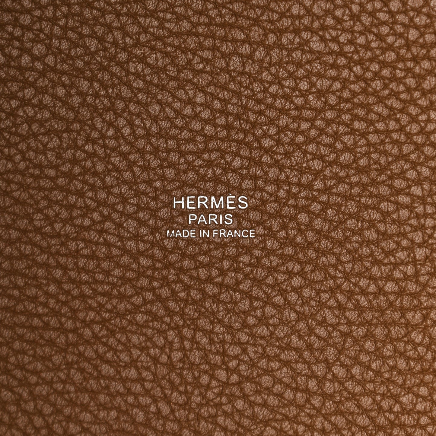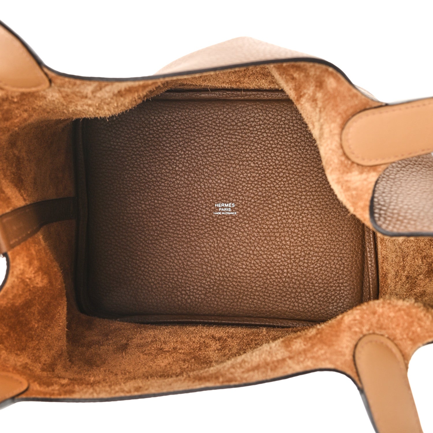 This is an authentic HERMES Taurillon Clemence Swift Eclat Picotin Lock 22 MM in Alezan and Biscuit. This stunning tote is crafted of luxuriously soft clemence calfskin leather in brown, in a relaxed bucket style, featuring silver palladium hardware. The bag features a unique one piece reinforced design with leather top handles and a thin cross over strap. The top is open to a matching suede interior.Follow this item for alerts. Hermes is a registered trademark of Hermes. FASHIONPHILE is not affiliated with Hermes.