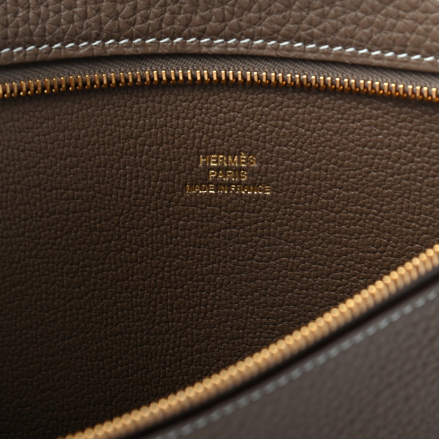 This is an authentic HERMES Togo Backpocket Pouch 30 in Etoupe. This stylish pouch is crafted of textured togo leather in gray. The polished gold plated top zipper opens to a leather interior.Follow this item for alerts. Hermes is a registered trademark of Hermes. FASHIONPHILE is not affiliated with Hermes.