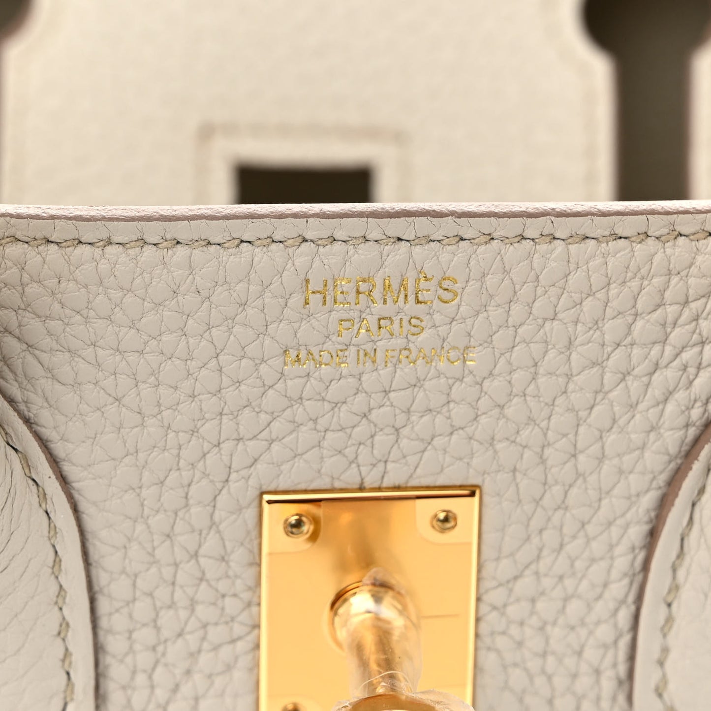 This is an authentic HERMES Togo Birkin 25 in Beton. This classic handbag is beautifully crafted of togo calfskin leather in off white. The bag features rolled leather top handles, a short front flap and strap closure with polished gold plated hardware including a turn lock and keys in the clochette. This opens to a matching goatskin leather interior with zipper and patch pockets.Follow this item for alerts. Hermes is a registered trademark of Hermes. FASHIONPHILE is not affiliated with Hermes.