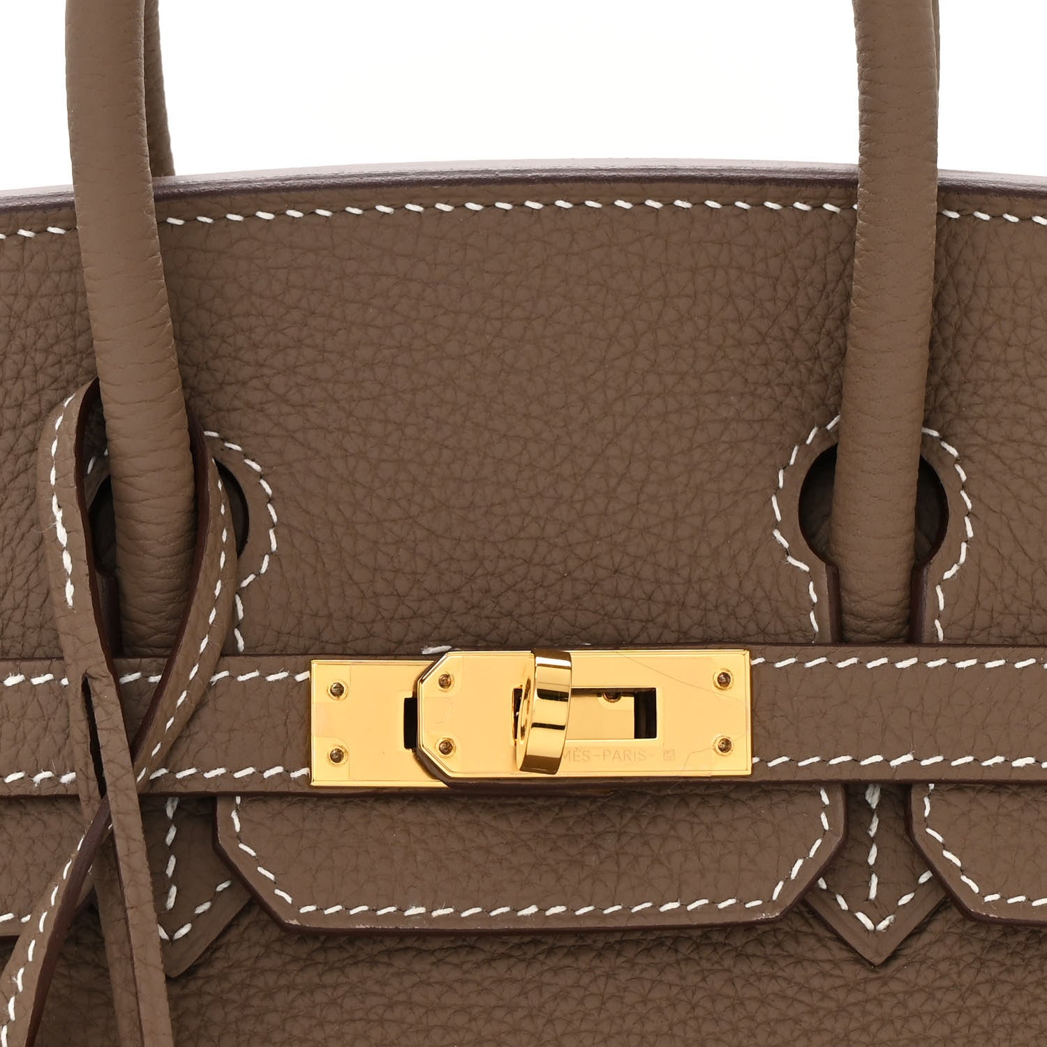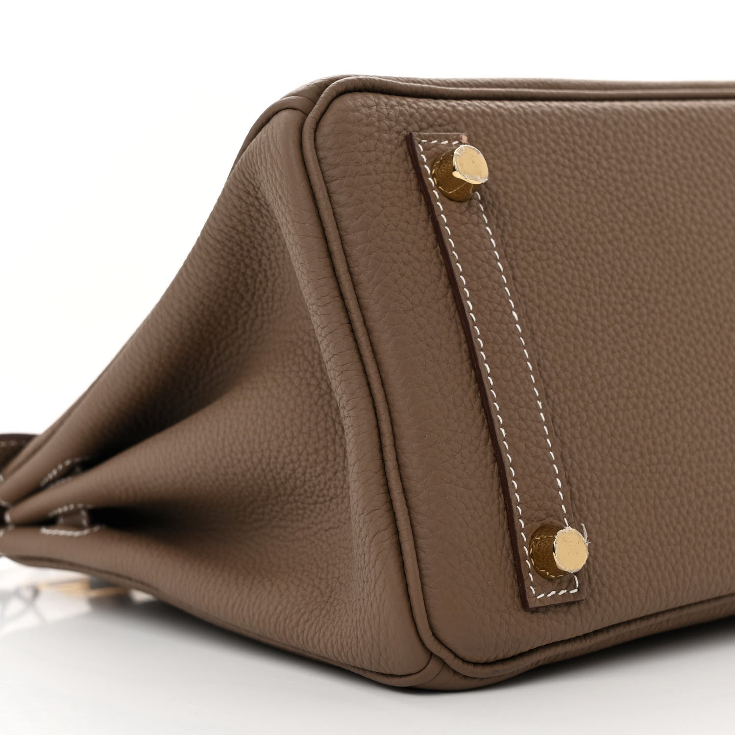 This is an authentic HERMES Togo Birkin 25 in Etoupe. This iconic handbag is hand-crafted of togo leather in taupe with white contrast stitching. The bag features rolled leather top handles, a short flap, and a cinch-style strap closure with gold links secured by a signature turn lock and optional padlock. The flap opens to a matching matte chevre goatskin leather interior with zipper and patch pockets.Follow this item for alerts. Hermes is a registered trademark of Hermes. FASHIONPHILE is not affiliated with Hermes.