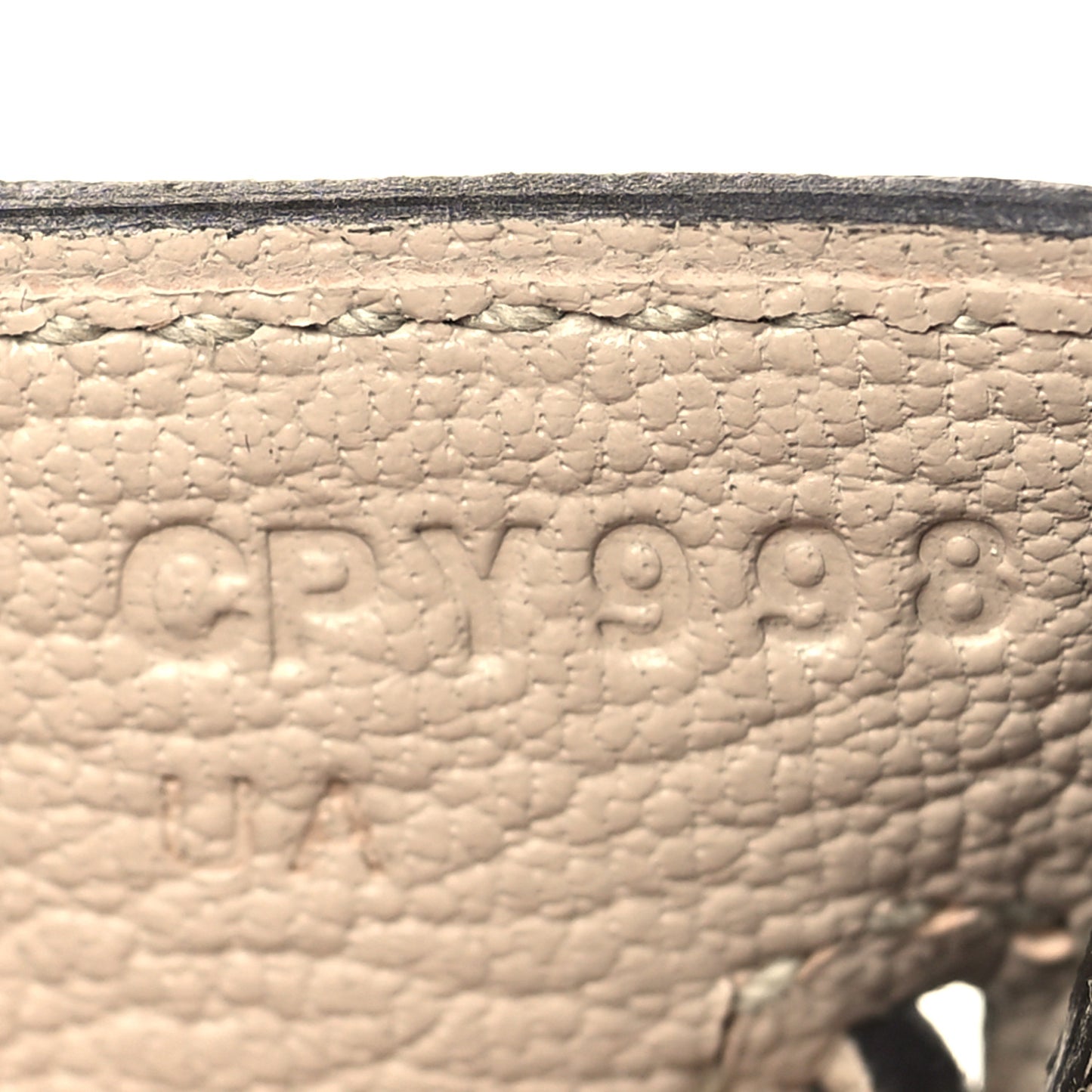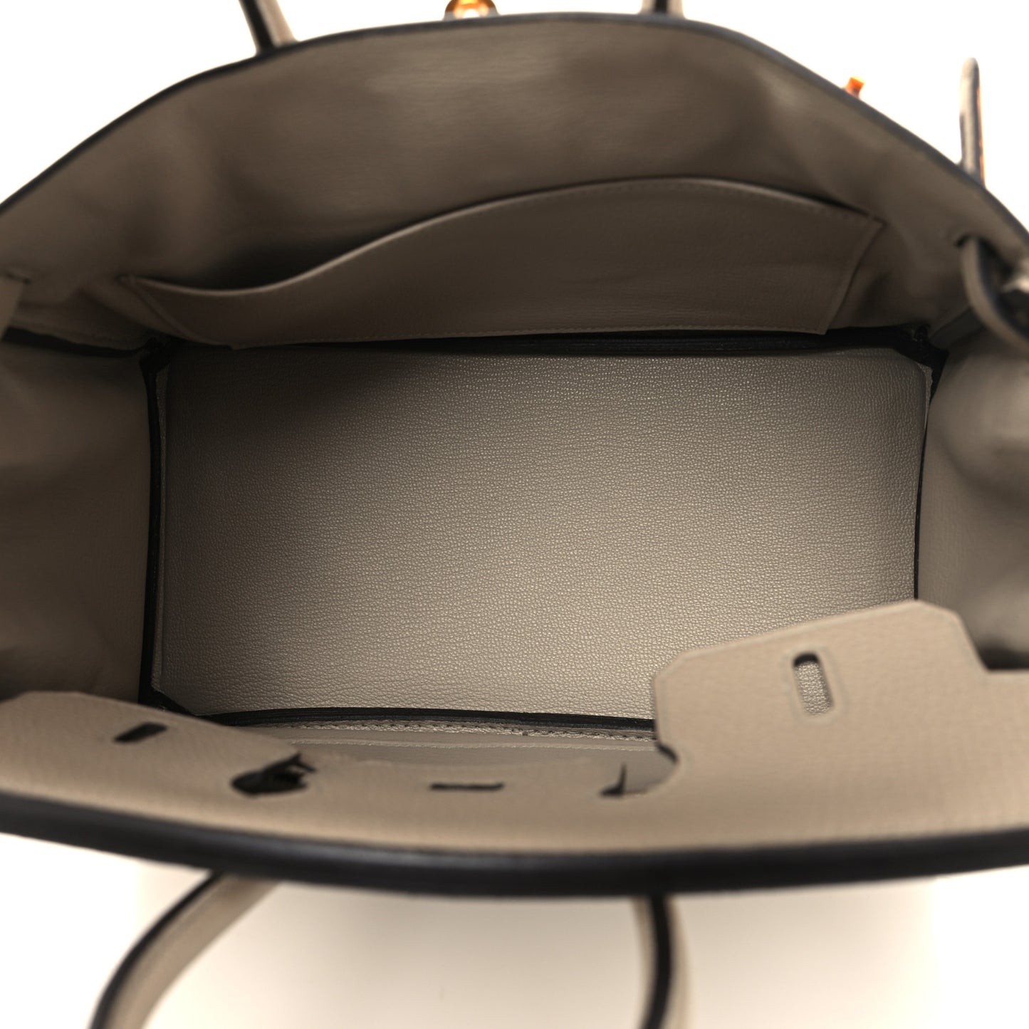 This is an authentic HERMES Togo Birkin 25 in Gris Tourterelle. This iconic handbag is finely handcrafted of Togo leather in taupe grey. The bag features rolled leather top handles, a short flap and a cinch-style strap closure with polished rose gold plated links, secured by a signature turn-lock. The flap opens to a matching matte chevre goatskin leather interior with zipper and patch pockets.Follow this item for alerts. Hermes is a registered trademark of Hermes. FASHIONPHILE is not affiliated with Hermes.