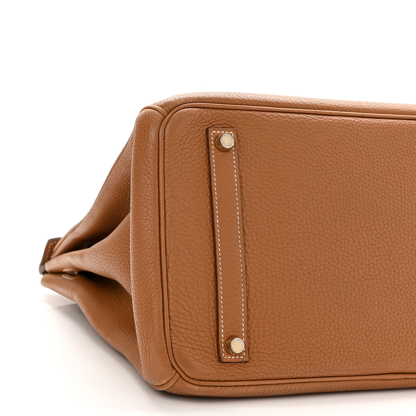 This is an authentic HERMES Togo Birkin 35 in Gold. This sophisticated handbag is finely crafted of grained togo leather in a classic camel brown with white contrast stitching. This iconic handbag features rolled leather top handles, a front flap with strap closure, and polished gold hardware. The top flap opens to a matching brown chèvre leather interior with zipper and patch pockets.Follow this item for alerts. Hermes is a registered trademark of Hermes. FASHIONPHILE is not affiliated with Hermes.