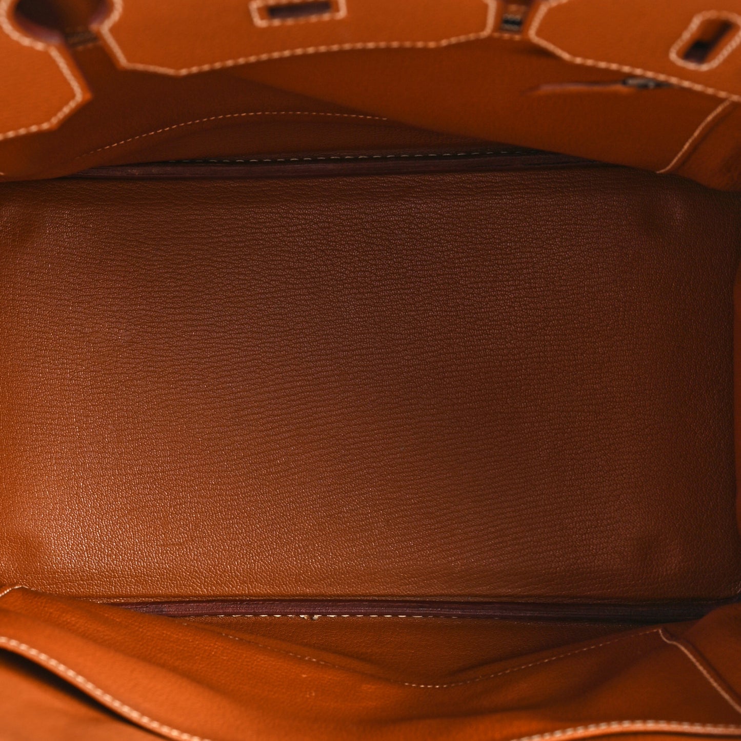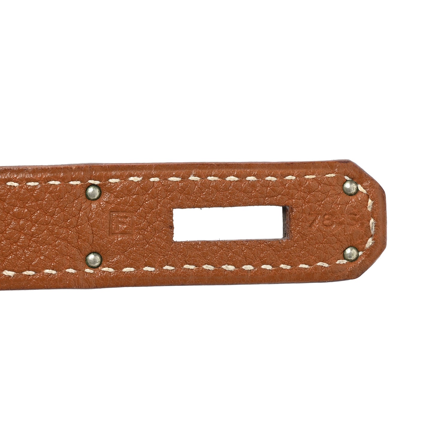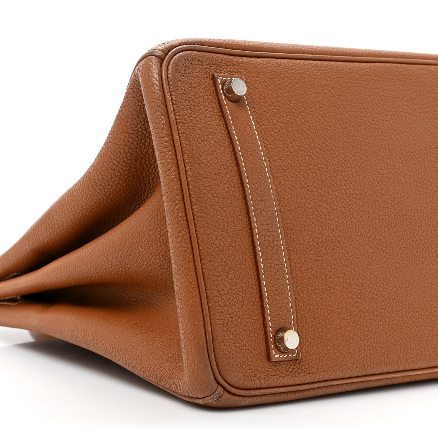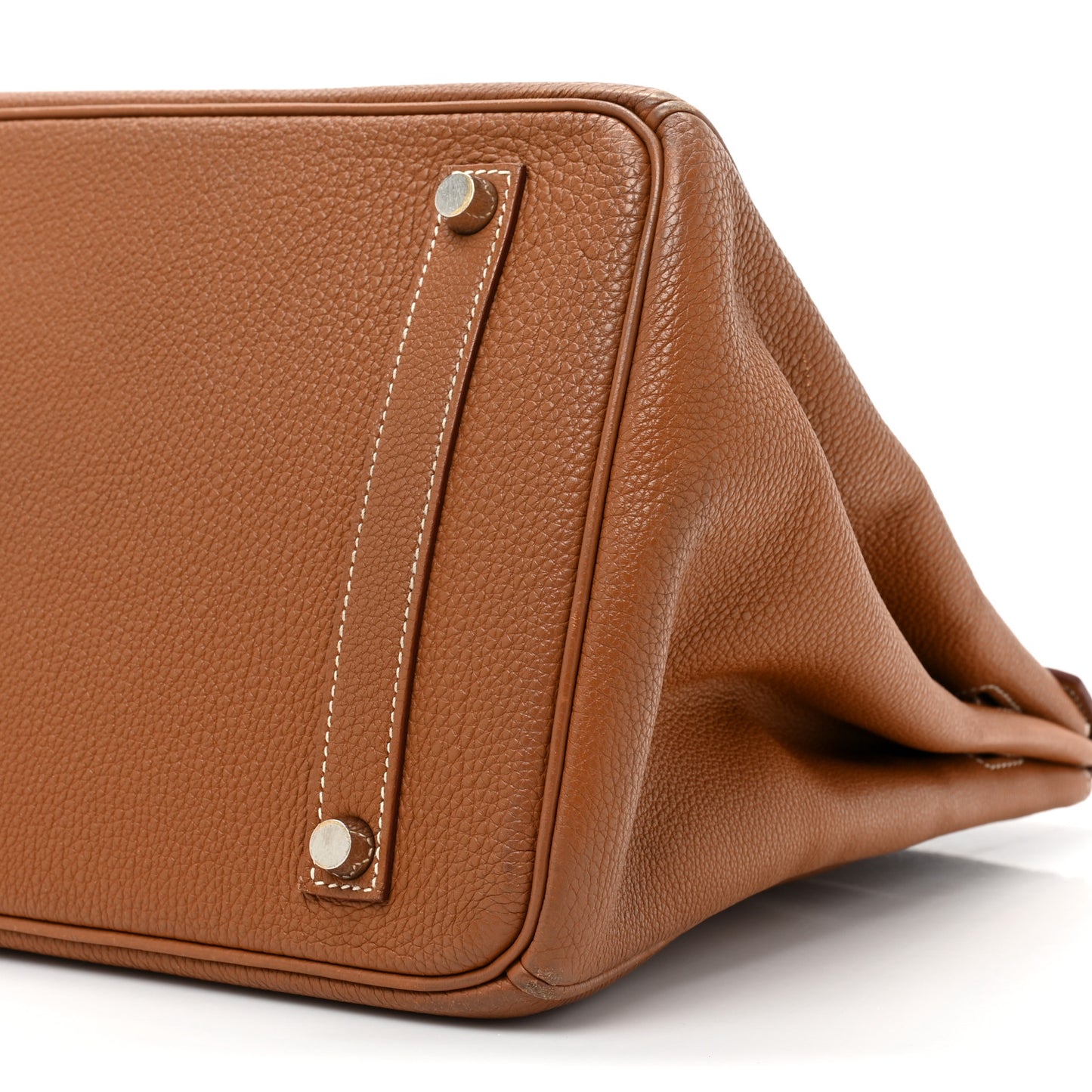 This is an authentic HERMES Togo Birkin 35 in Gold. This iconic handbag is finely crafted of grained golden brown calfskin leather. The bag features rolled leather top handles, a leather belt, and a polished silver palladium plated turn lock with a padlock and a hanging clochette for the keys. This opens to a matching leather interior with zipper and patch pockets.Follow this item for alerts. Hermes is a registered trademark of Hermes. FASHIONPHILE is not affiliated with Hermes.
