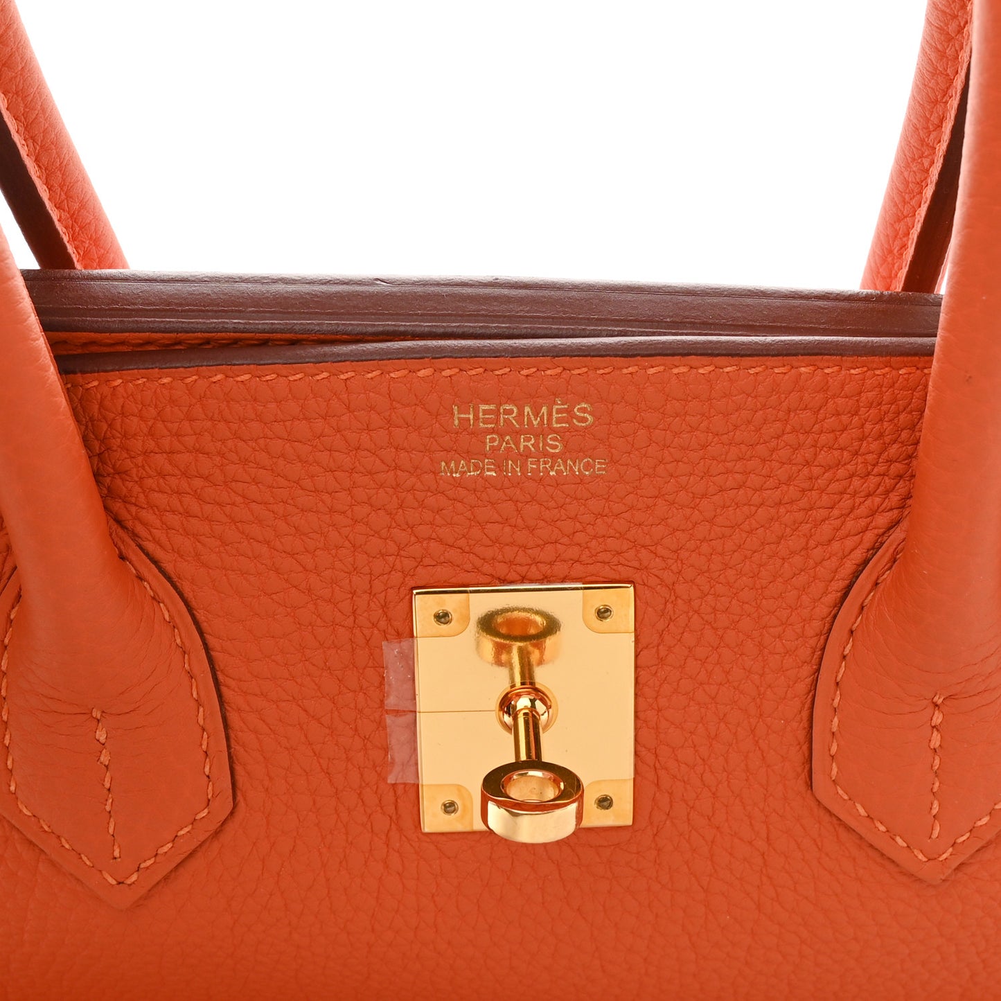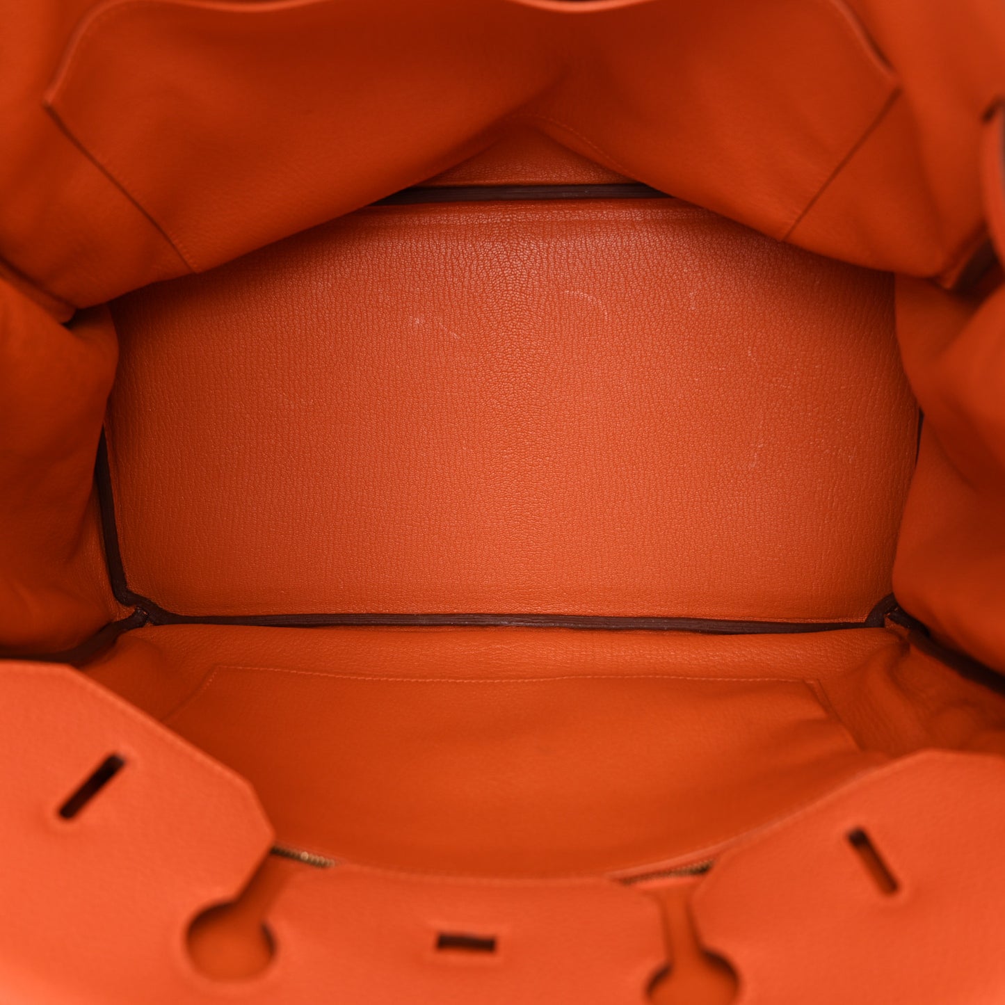 This is an authentic HERMES Togo Birkin 35 in Orange. This stylish Birkin tote is crafted of richly textured togo calfskin leather in orange. The handbag features rolled leather top handles and a cross over flap and include a hanging clochette and keys. The flap has a two-strap closure with gold plated links, a turn lock, and a padlock. This stylish handbag opens to an orange chevre leather interior with zipper and patch pockets.Follow this item for alerts. Hermes is a registered trademark of Hermes. FASHIONPHILE is not affiliated with Hermes.