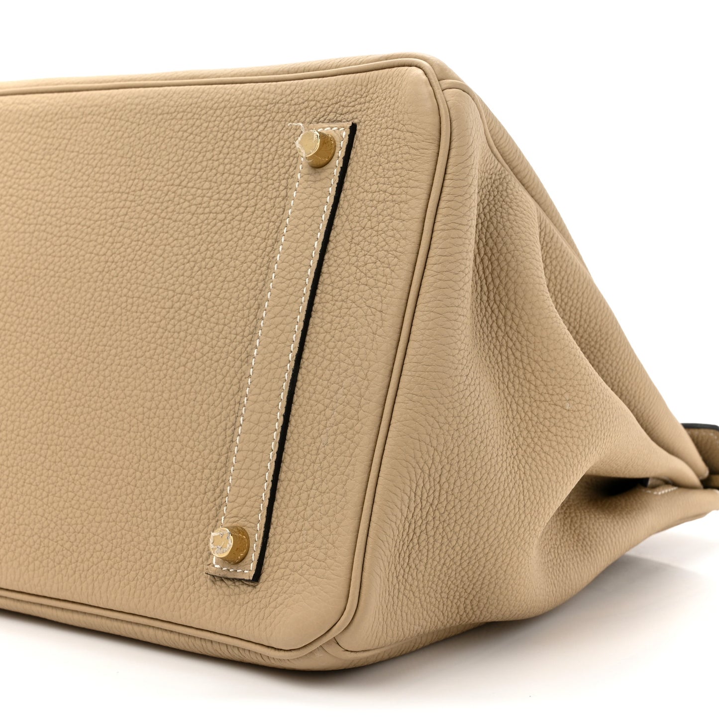 This is an authentic HERMES Togo Birkin 35 in Trench. This elegant and classic Birkin handbag is crafted of luxurious togo calfskin leather in beige. The bag features rolled leather top handles, a front flap with a strap closure, polished gold links, a turn lock, padlock and a hanging clochette with keys. The top flap opens to a matte goatskin leather interior with pockets.Follow this item for alerts. Hermes is a registered trademark of Hermes. FASHIONPHILE is not affiliated with Hermes.