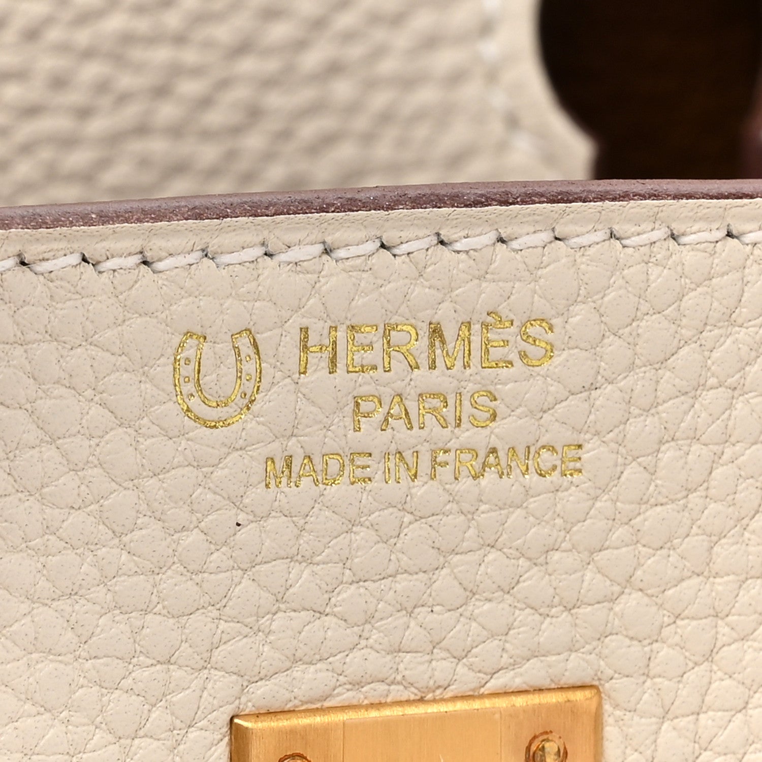 This is an authentic HERMES Togo Horseshoe Birkin 25 in Craie and Gold. This handbag is crafted of luxurious togo leather in beige and brown. It features leather top handles, a cross-over flap and a strap closure with brushed gold-plated hardware including a padlock and keys inside a leather clochette. This opens to a matching chevre leather interior with zipper and patch pockets.Follow this item for alerts. Hermes is a registered trademark of Hermes. FASHIONPHILE is not affiliated with Hermes.