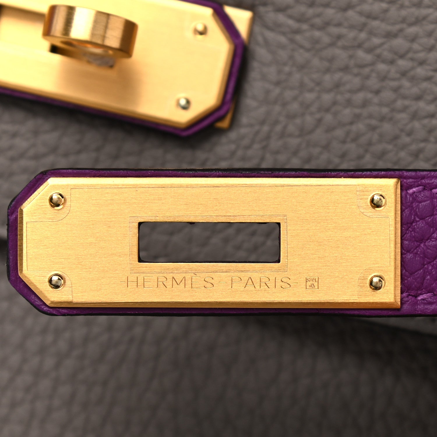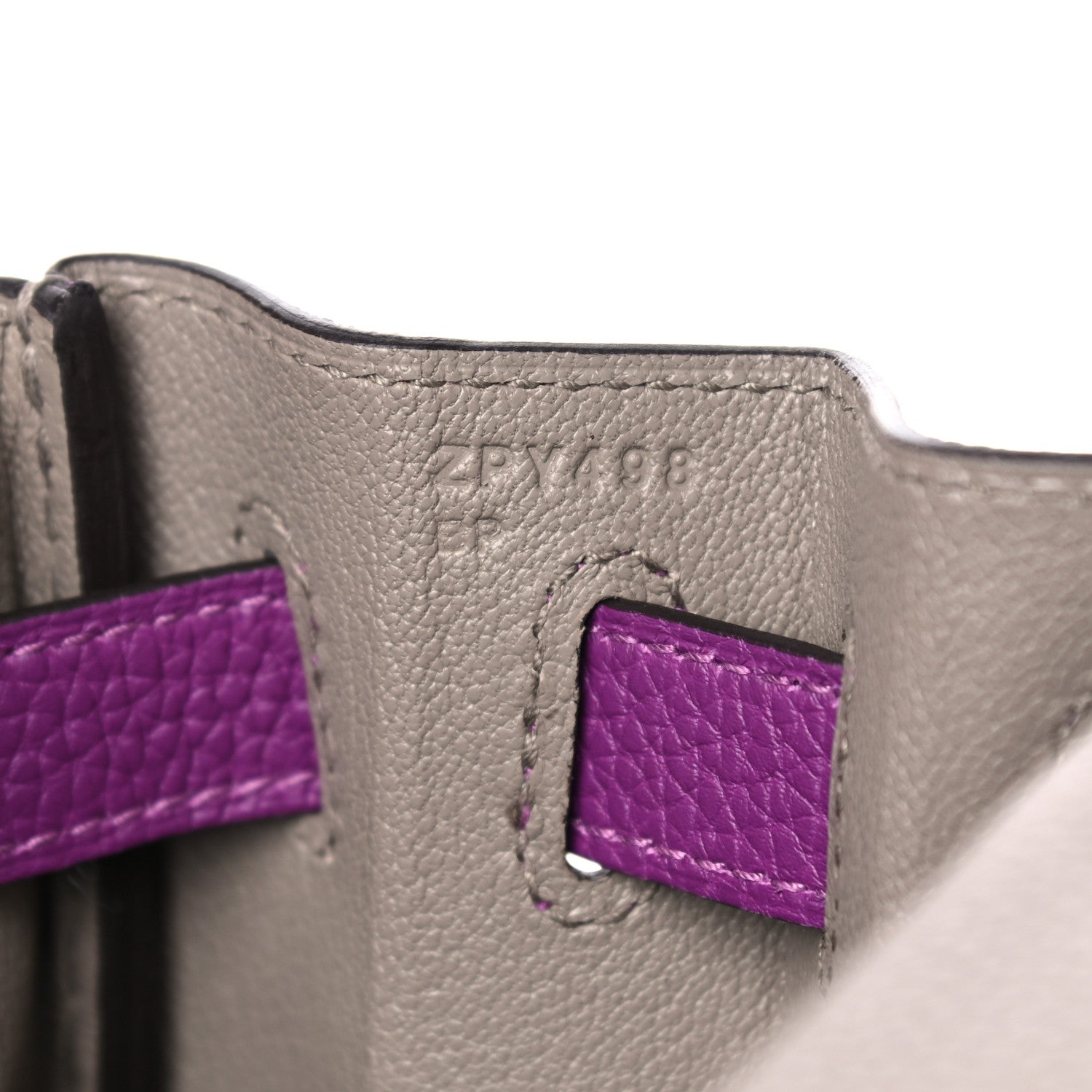 This is an authentic HERMES Togo Horseshoe Kelly Retourne 28 in Gris Asphalte and Anemone. This rare and iconic Horseshoe Kelly bag is finely crafted of textured bullhide leather in grey with purple trim. This handbag has the classic Kelly features including the iconic structured shape complemented by a small top flap and straps with a gold plated turn lock. Other hardware includes anchors at the long leather shoulder strap as well as at the feet. The flap opens to a grey leather interior with zipper and patch pockets.Follow this item for alerts. Hermes is a registered trademark of Hermes. FASHIONPHILE is not affiliated with Hermes.