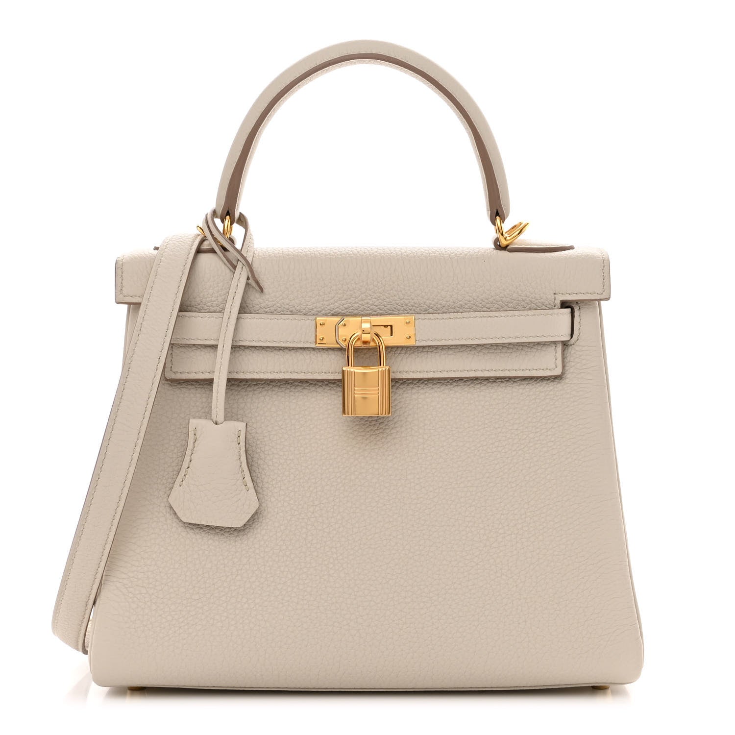 This is an authentic HERMES Togo Kelly Retourne 25 in Beton. This chic and iconic handbag is expertly handcrafted of grained calfskin leather in off white. The bag features rolled leather top handles, a short front flap with a strap closure with gold plated hardware including a padlock and leather covered keys, as well as an optional shoulder strap. The top flap opens to a goatskin leather interior with zipper and patch pockets.Follow this item for alerts. Hermes is a registered trademark of Hermes. FASHIONPHILE is not affiliated with Hermes.