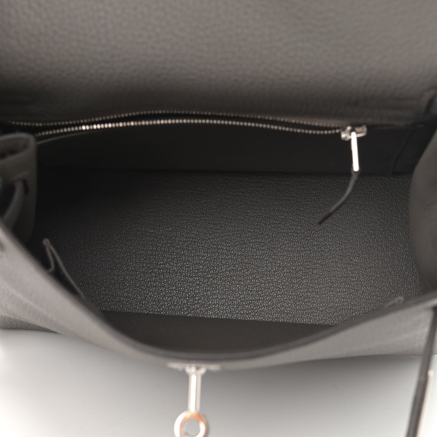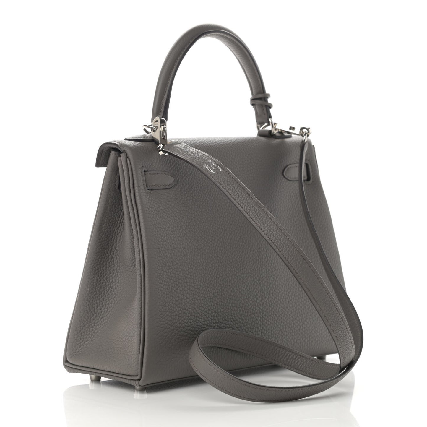 This is an authentic HERMES Togo Kelly Retourne 25 in Etain. This chic and iconic handbag is expertly handcrafted of grained calfskin leather in dark grey. The bag features a rolled leather top handle, a short front flap with a strap closure with palladium hardware including a padlock and keys, as well as an optional shoulder strap. The top flap opens to a goatskin leather interior with zipper and patch pockets.Follow this item for alerts. Hermes is a registered trademark of Hermes. FASHIONPHILE is not affiliated with Hermes.