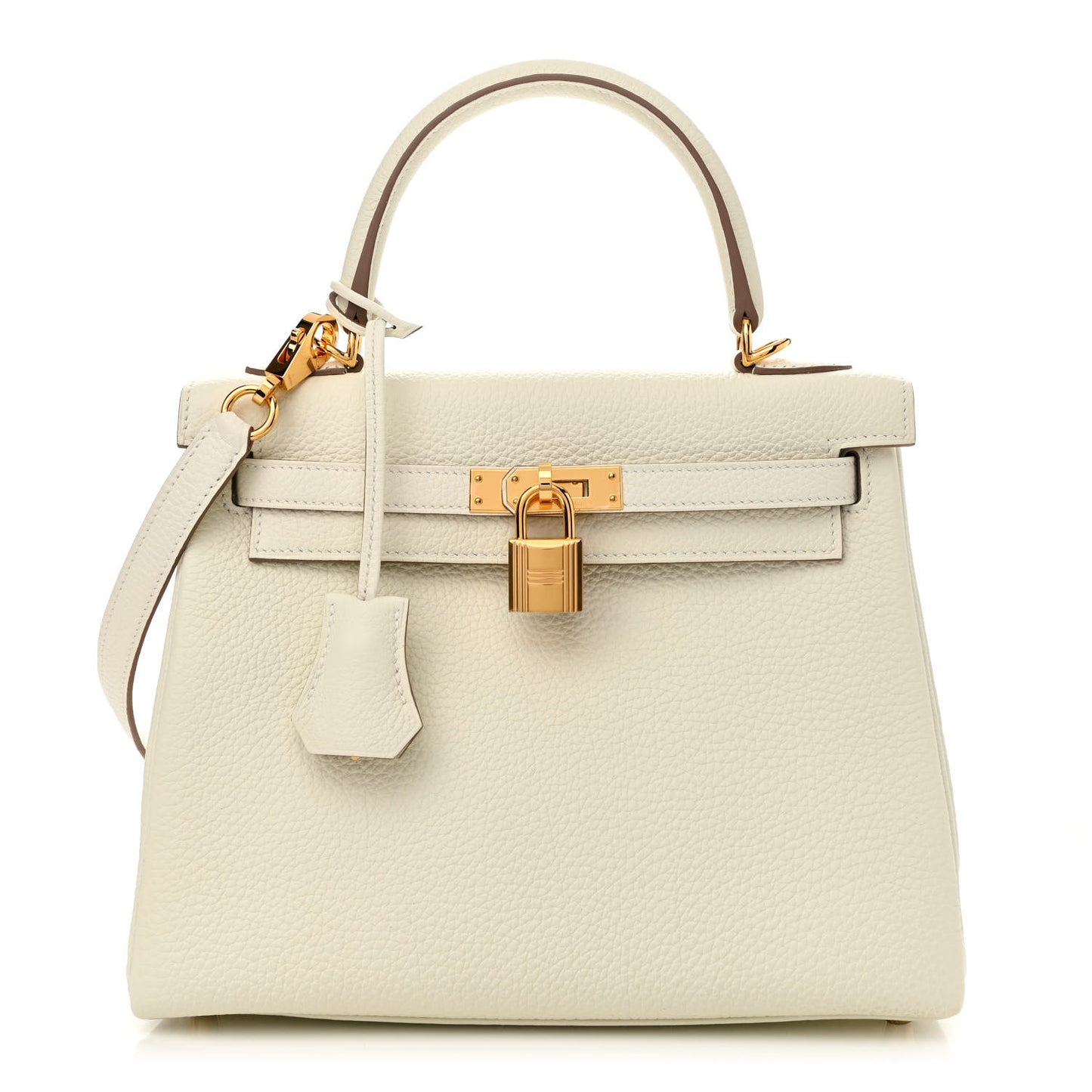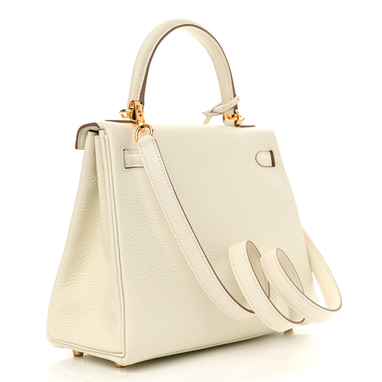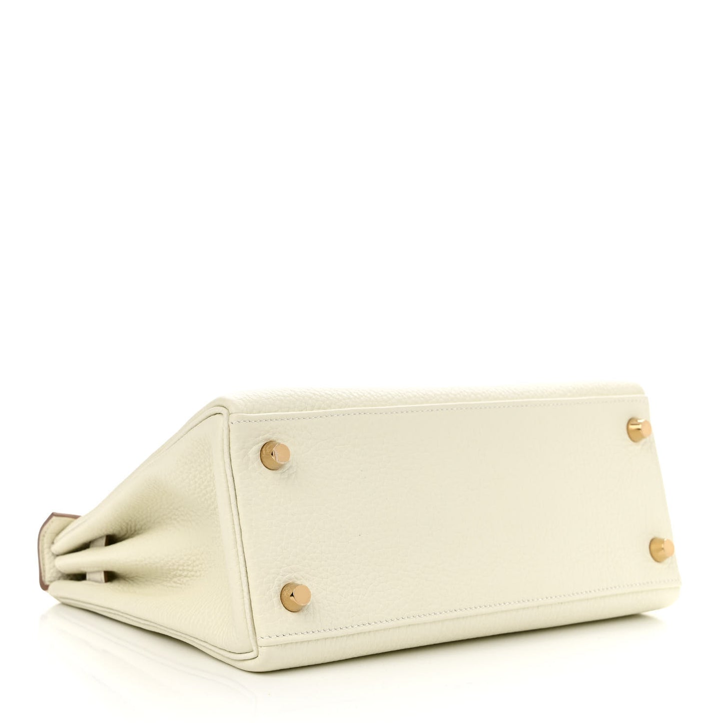 This is an authentic HERMES Togo Kelly Retourne 25 in Mushroom. This chic and iconic handbag is expertly handcrafted of grained calfskin leather in off white. The bag features rolled leather top handles, a short front flap with a strap closure with gold plated hardware including a padlock and leather covered keys, as well as an optional shoulder strap. The top flap opens to a matching goatskin leather interior with zipper and patch pockets.Follow this item for alerts. Hermes is a registered trademark of Hermes. FASHIONPHILE is not affiliated with Hermes.