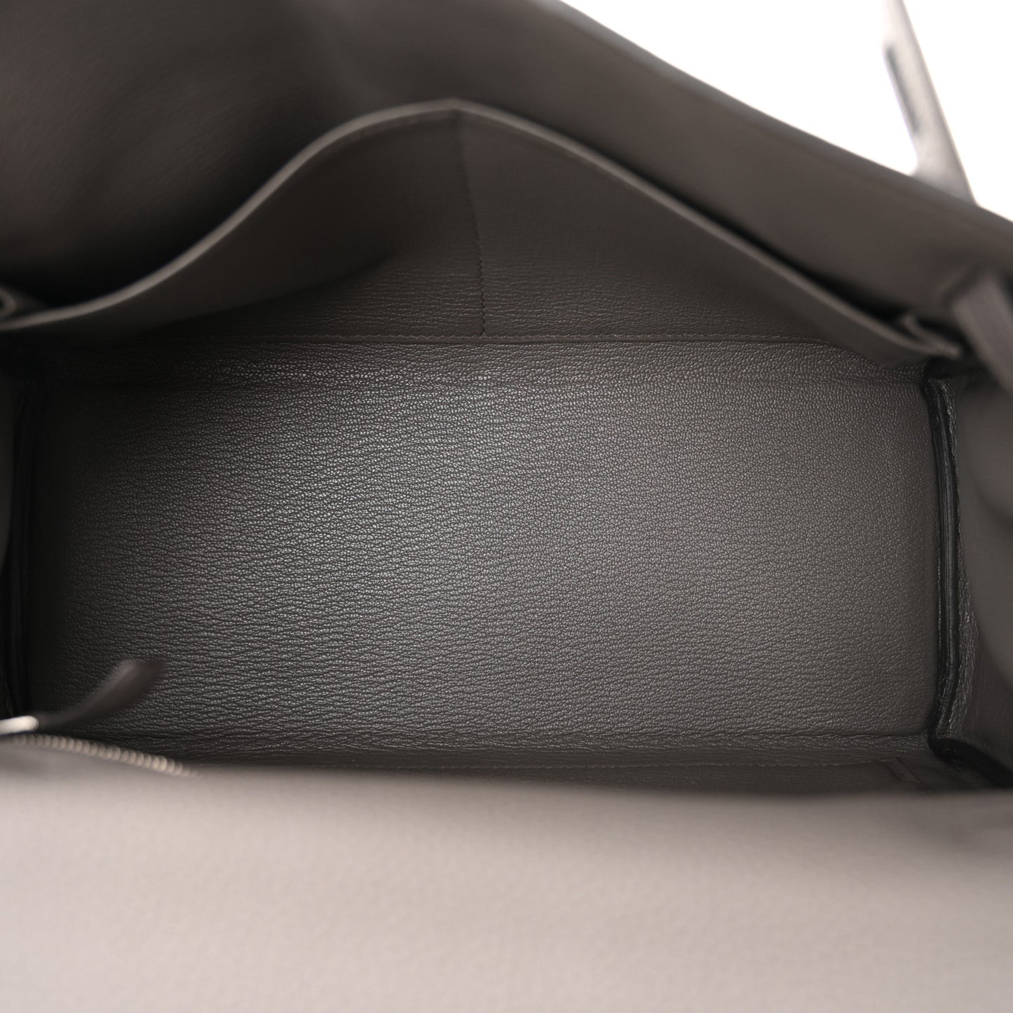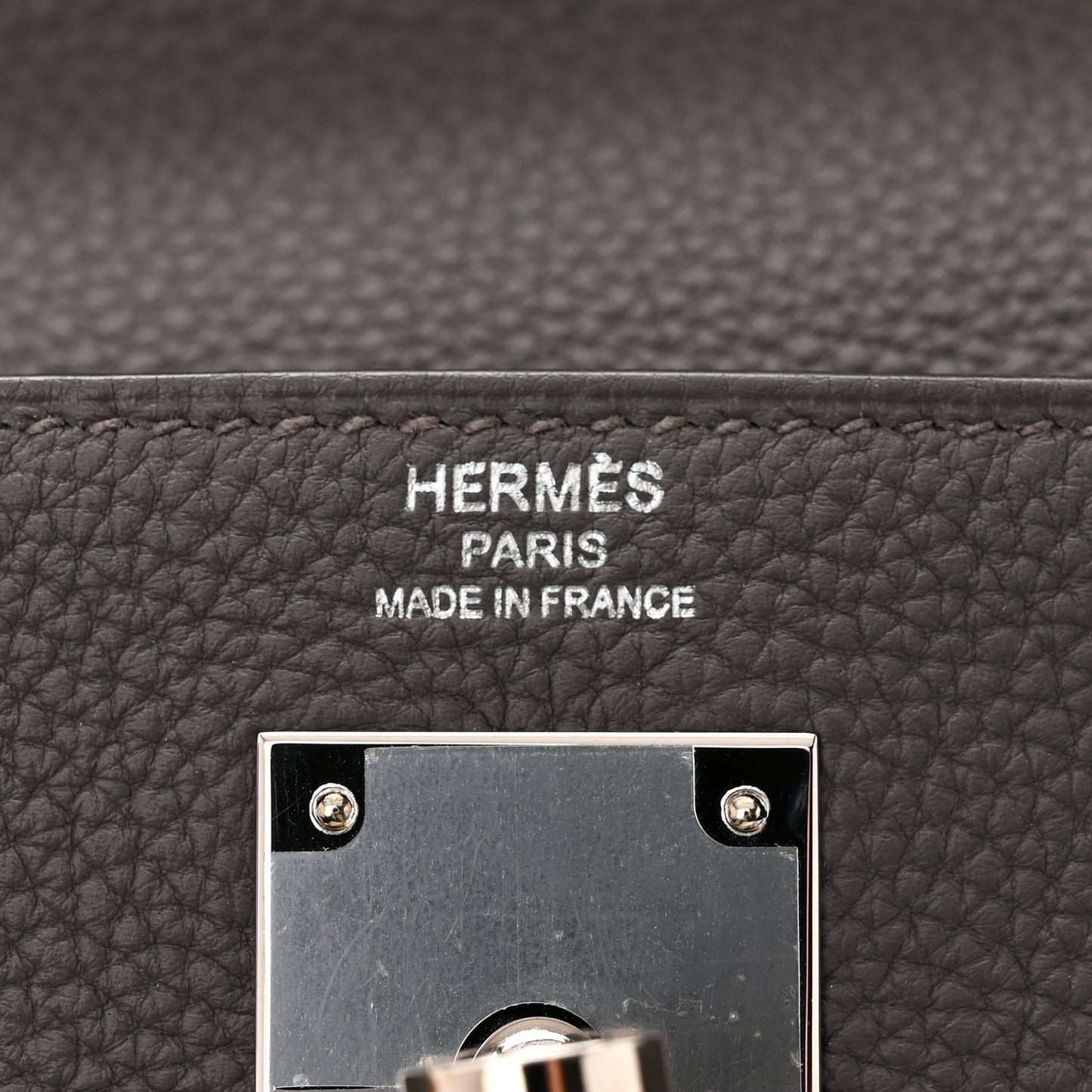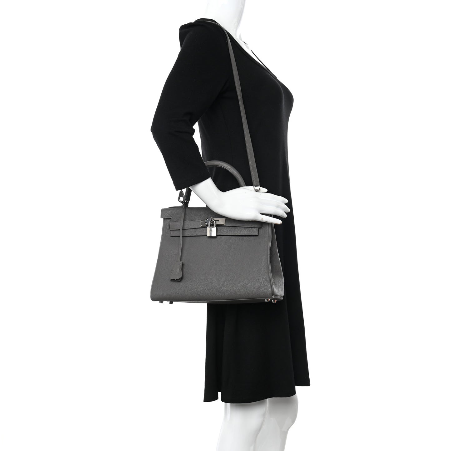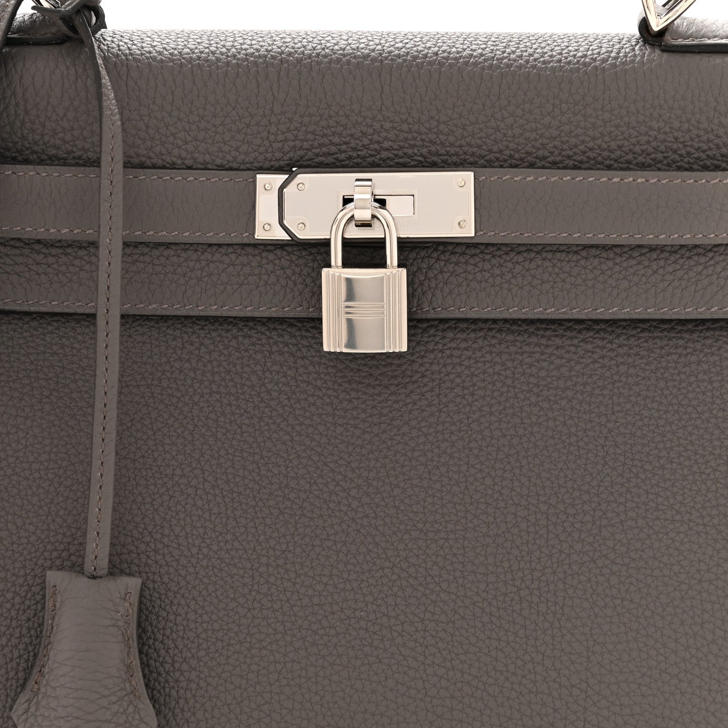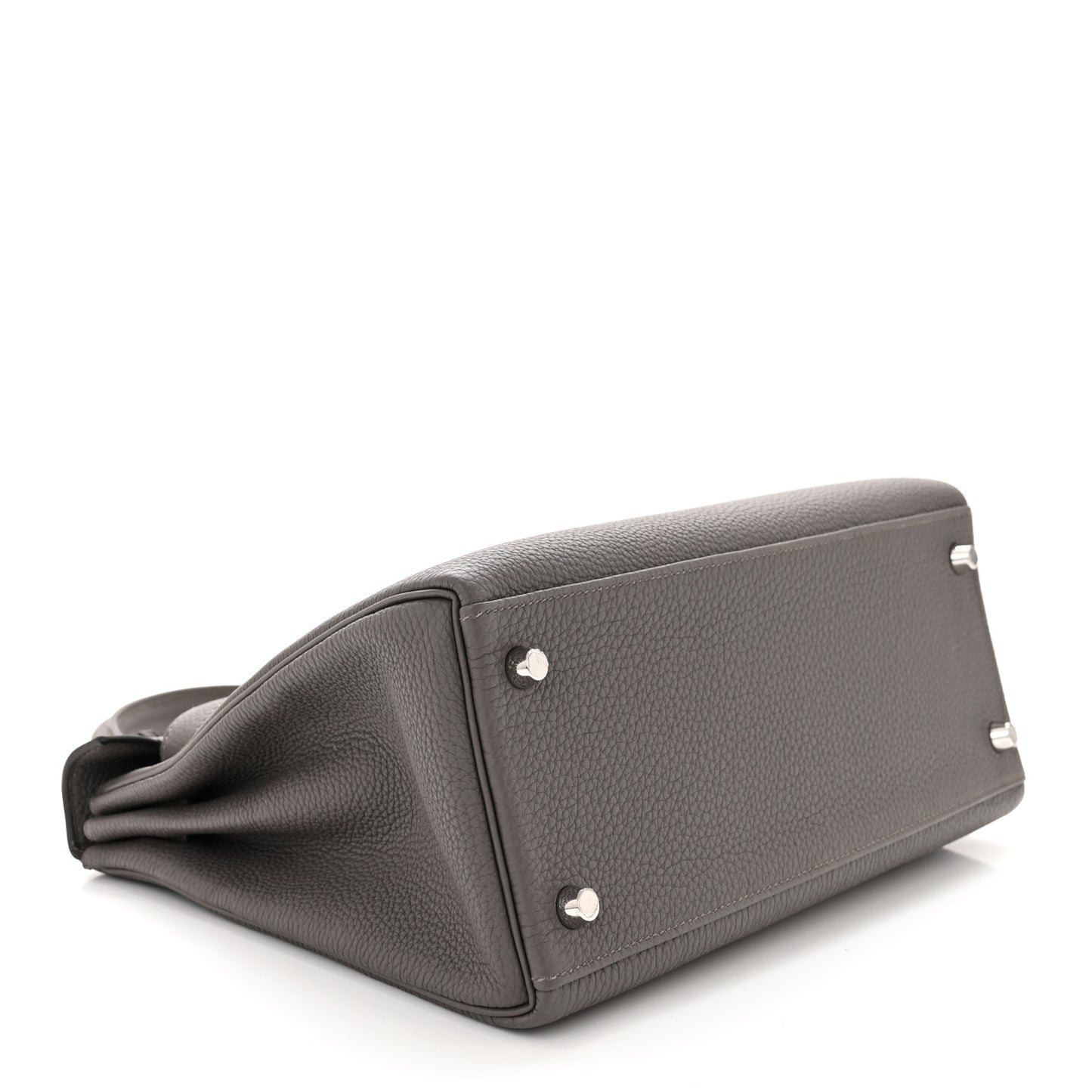 This is an authentic HERMES Togo Kelly Retourne 28 in Etain. This chic and iconic handbag is expertly handcrafted of grained calfskin leather in gray. The bag features rolled leather top handles, a short front flap with a strap closure with palladium hardware including a padlock and leather covered keys, as well as an optional shoulder strap. The top flap opens to a goatskin leather interior with zipper and patch pockets.Follow this item for alerts. Hermes is a registered trademark of Hermes. FASHIONPHILE is not affiliated with Hermes.
