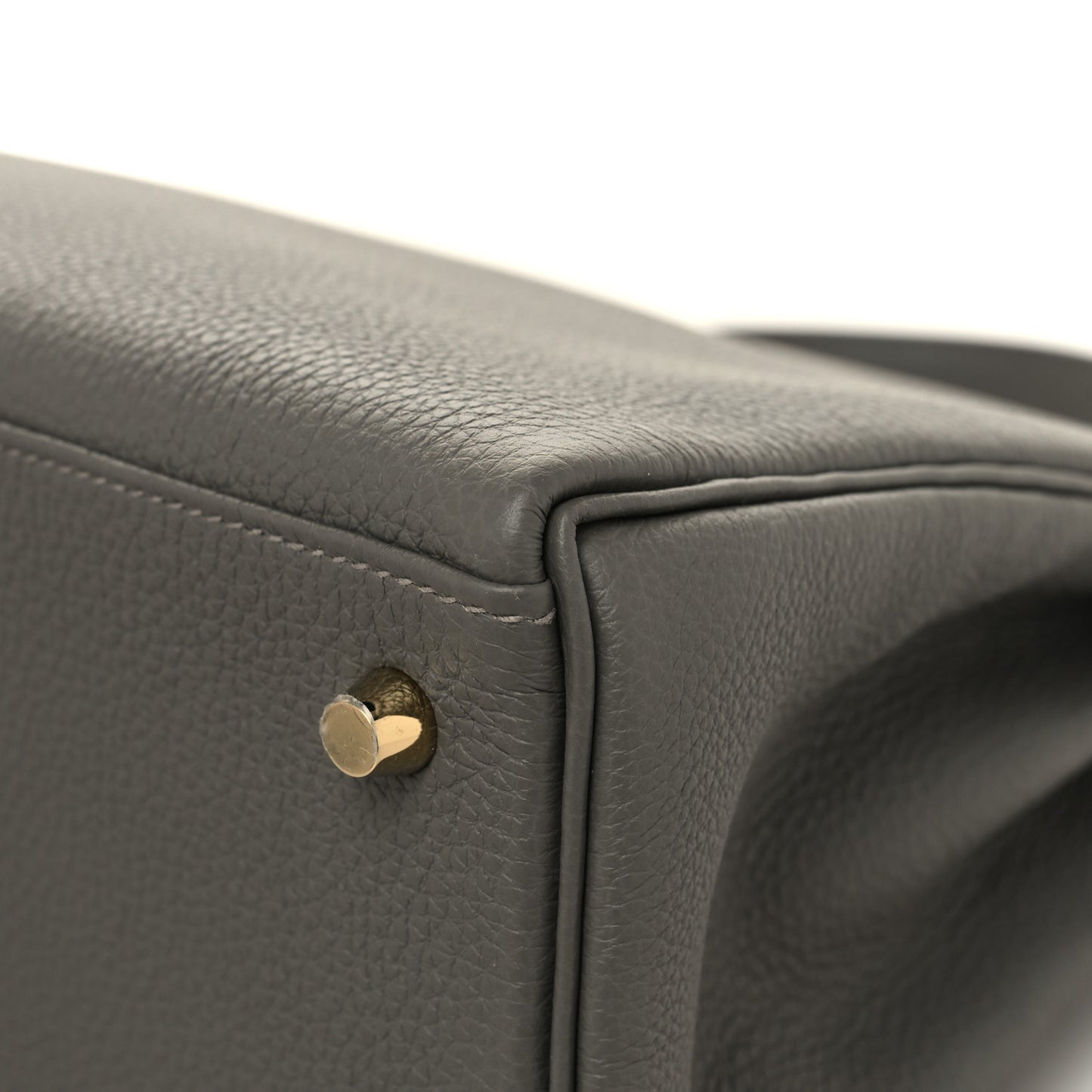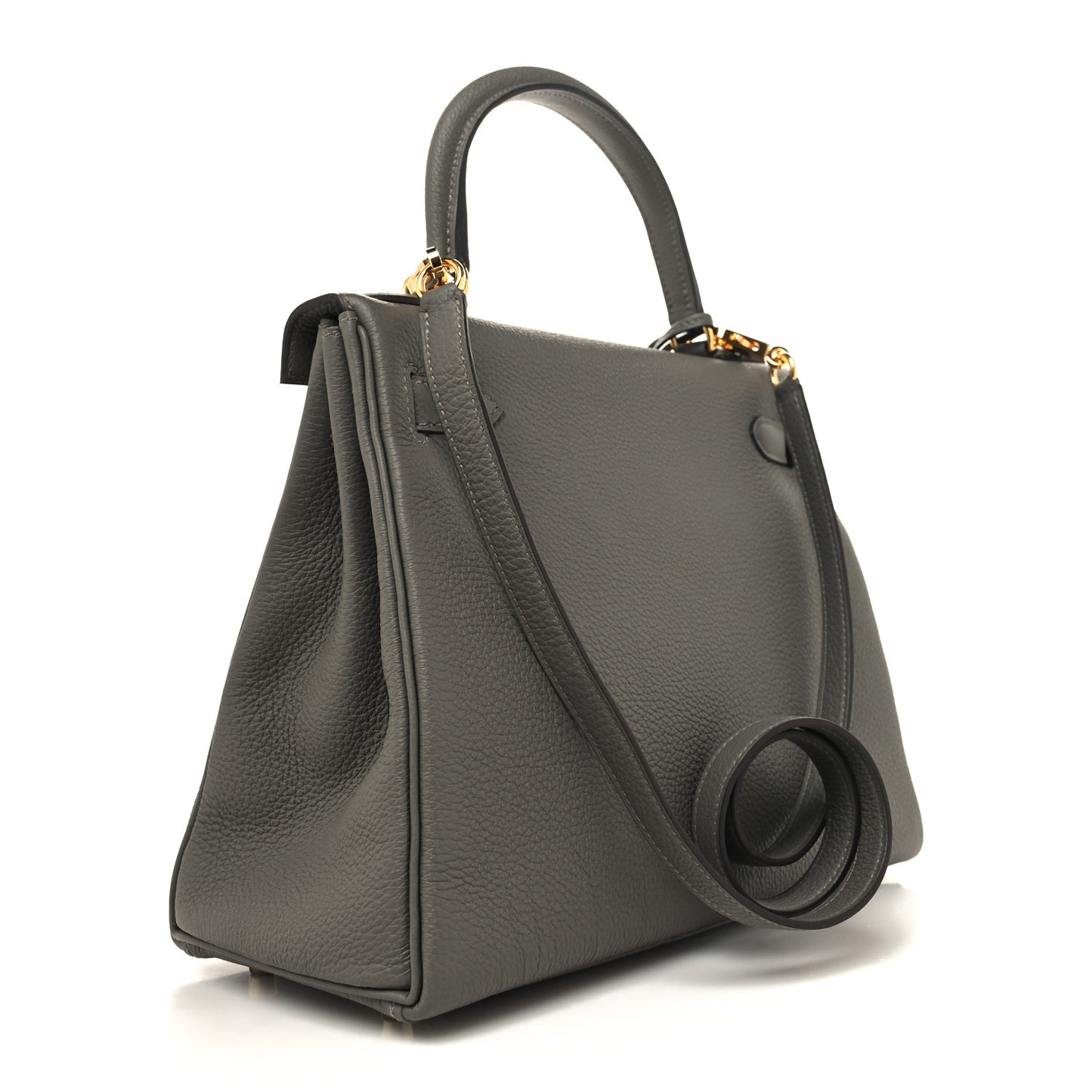 This is an authentic HERMES Togo Kelly Retourne 28 in Gris Meyer. This Kelly handbag is crafted of richly textured calfskin leather in dark grey. The bag features a reinforced leather top handle, an optional leather shoulder strap, and a crossover flap with gold-plated hardware. The hardware includes a Kelly turn lock with padlock and clochette with keys. The flap opens to a matching goatskin leather interior with zipper and patch pockets.Follow this item for alerts. Hermes is a registered trademark of Hermes. FASHIONPHILE is not affiliated with Hermes.