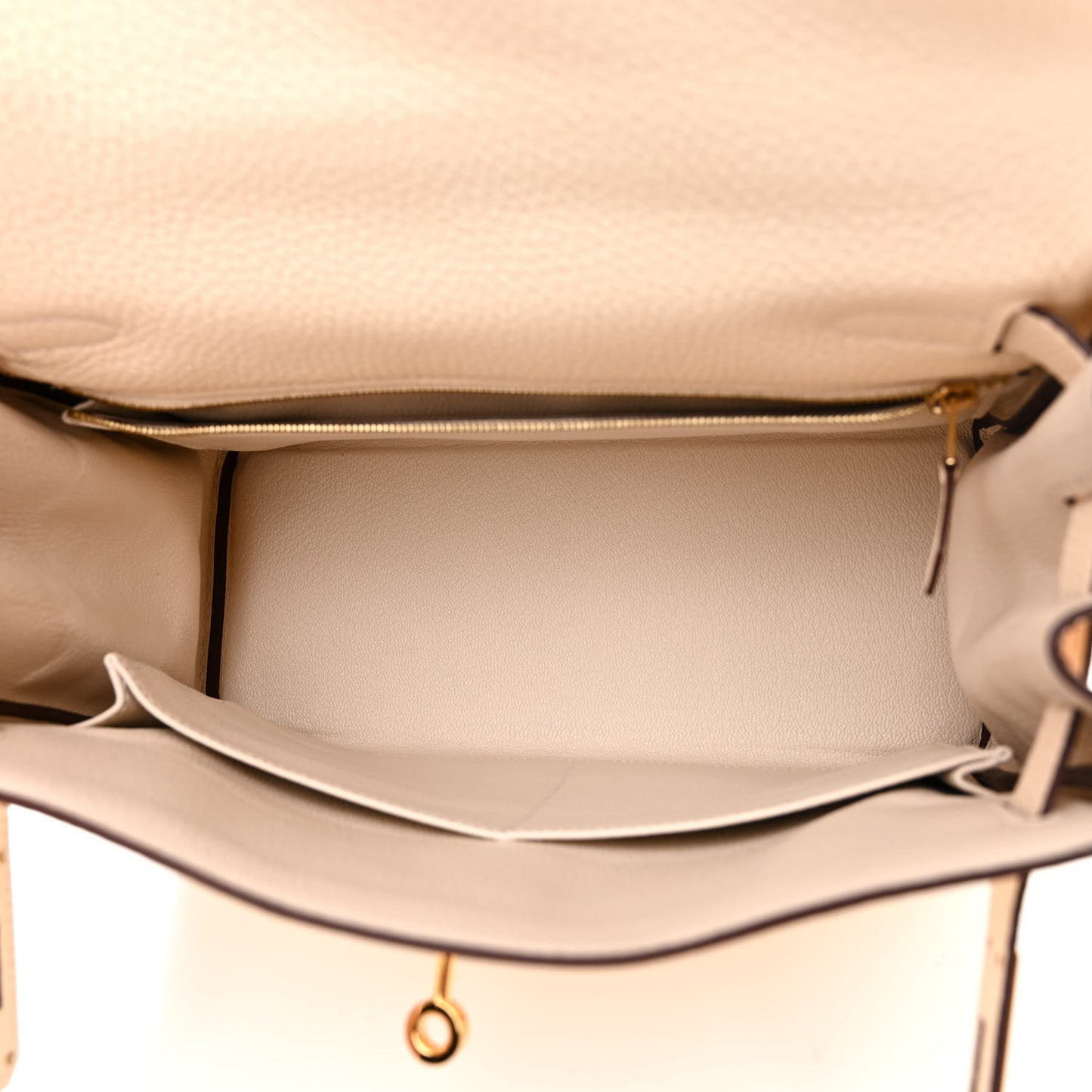 This is an authentic HERMES Togo Kelly Retourne 28 in Nata. This stylish Kelly handbag classic is crafted of beautifully textured calfskin leather in creme. The bag features a leather clasp top handle, an optional shoulder strap, a cross over flap with a strap closure and a signature Kelly gold plated turn lock. These open to a matching chevre goatskin leather interior with zipper and patch pockets.Follow this item for alerts. Hermes is a registered trademark of Hermes. FASHIONPHILE is not affiliated with Hermes.