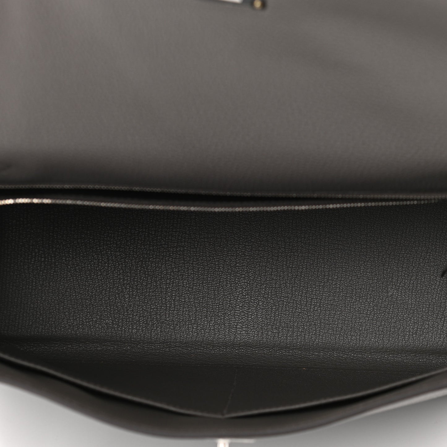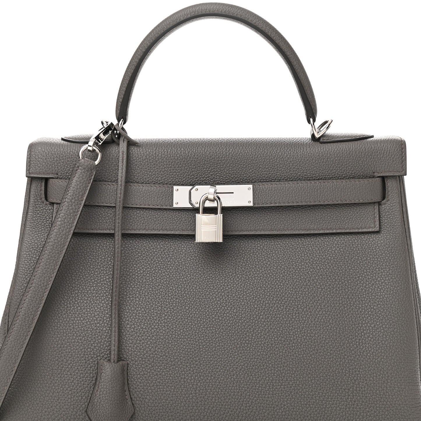 This is an authentic HERMES Togo Kelly Retourne 32 in Etain. This Kelly handbag is crafted of richly textured calfskin leather in grey. The bag features a reinforced leather top handle, an optional shoulder strap with palladium silver hardware links, and signature Kelly turn lock, padlock, with a clochette and keys. The flap opens to a matte leather interior with a zipper and flat pockets.
