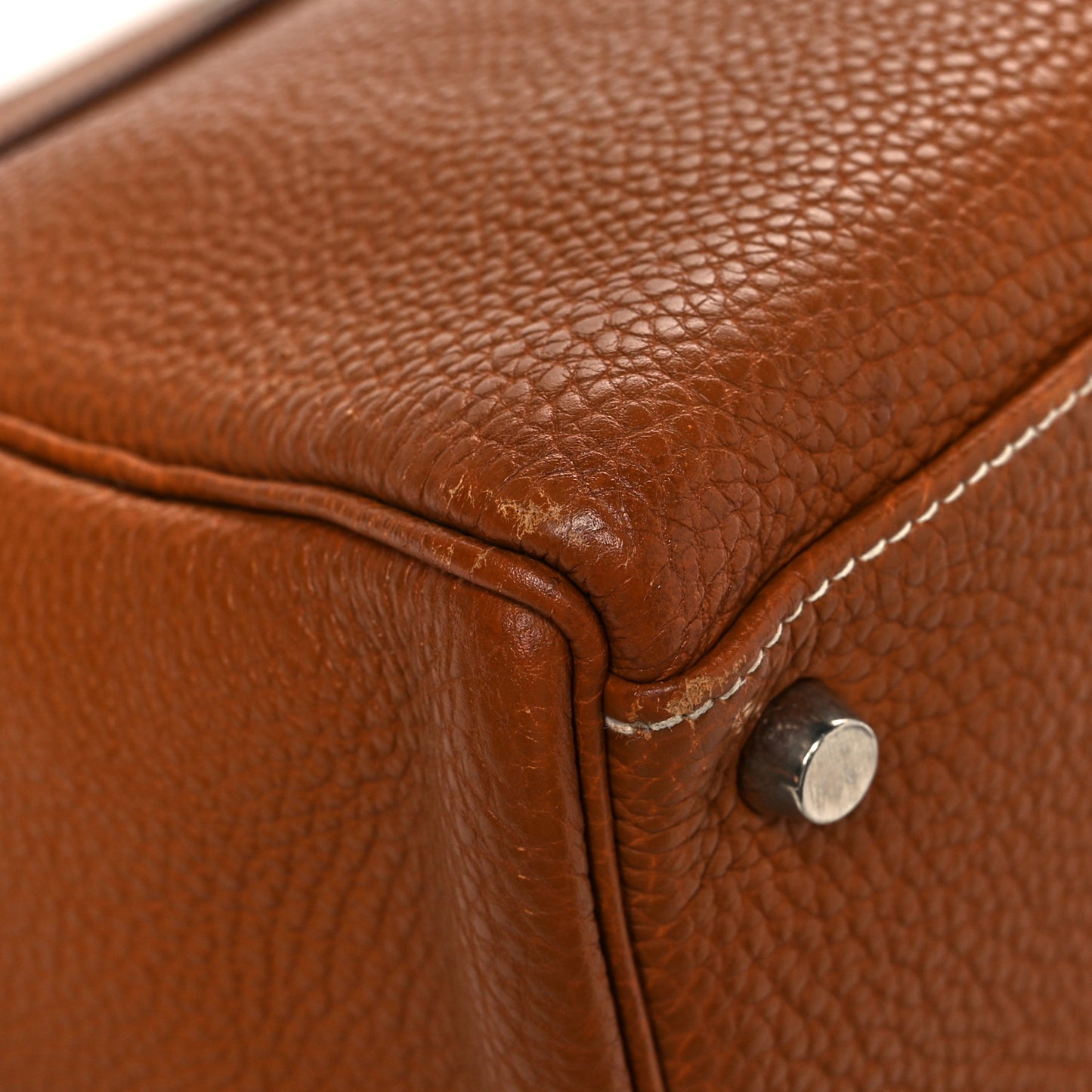 This is an authentic HERMES Togo Kelly Retourne 32 in Gold. This handbag is crafted of richly textured calfskin leather in a beautiful shade of golden brown. The bag features a reinforced leather top handle, an optional leather shoulder strap with palladium plated hardware, and a short crossover flap, secured with a strap and Kelly turn-lock closure. The bag opens to a matte leather interior with zipper and flat pockets.Follow this item for alerts. Hermes is a registered trademark of Hermes. FASHIONPHILE is not affiliated with Hermes.