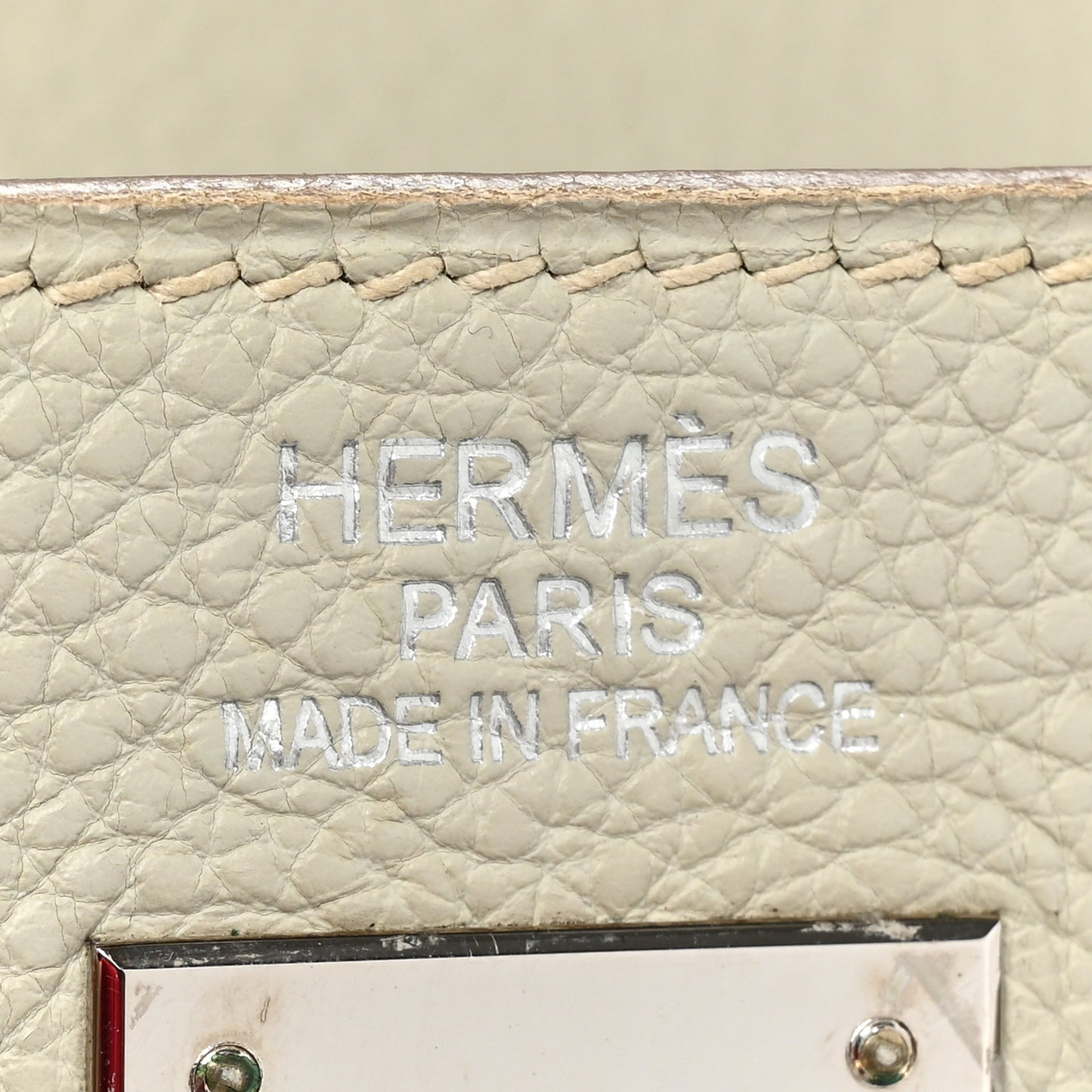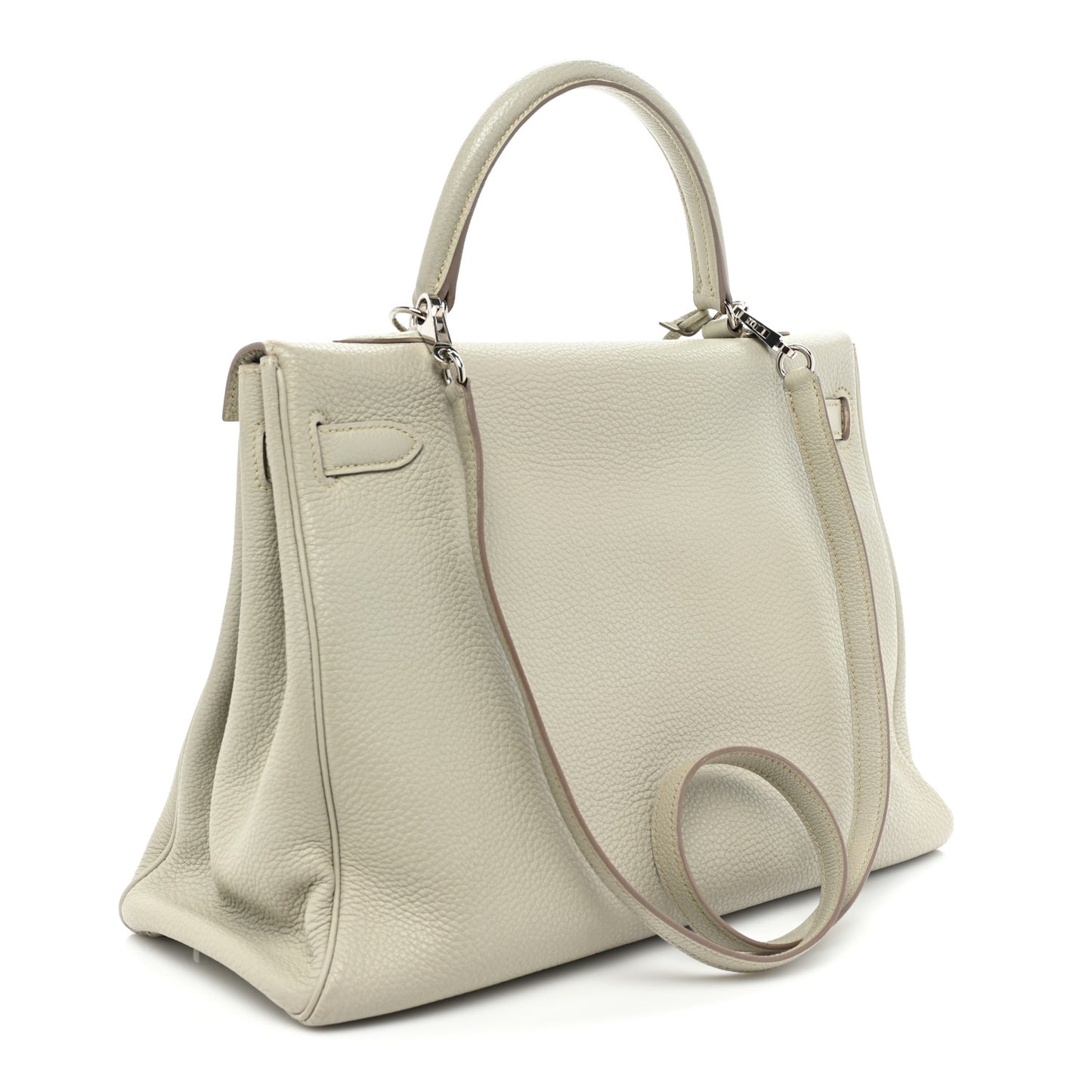 This is an authentic HERMES Togo Kelly Retourne 35 in Gris Perle. This stunning Hermes classic handbag is beautifully crafted of grained calfskin leather in light pearly beige. The bag features a reinforced single leather top handle, an optional shoulder strap, a frontal flap and polished palladium hardware. The flap opens to a leather interior with zipper and patch pockets.