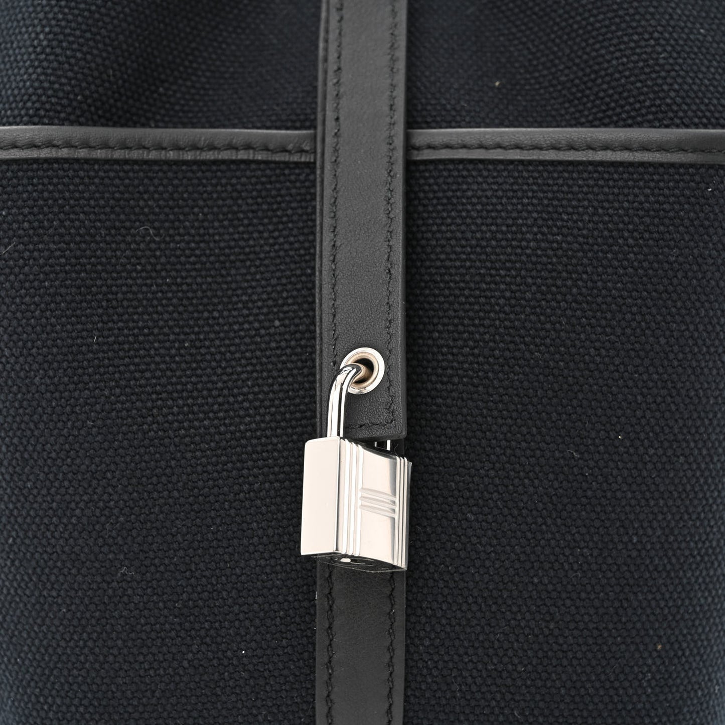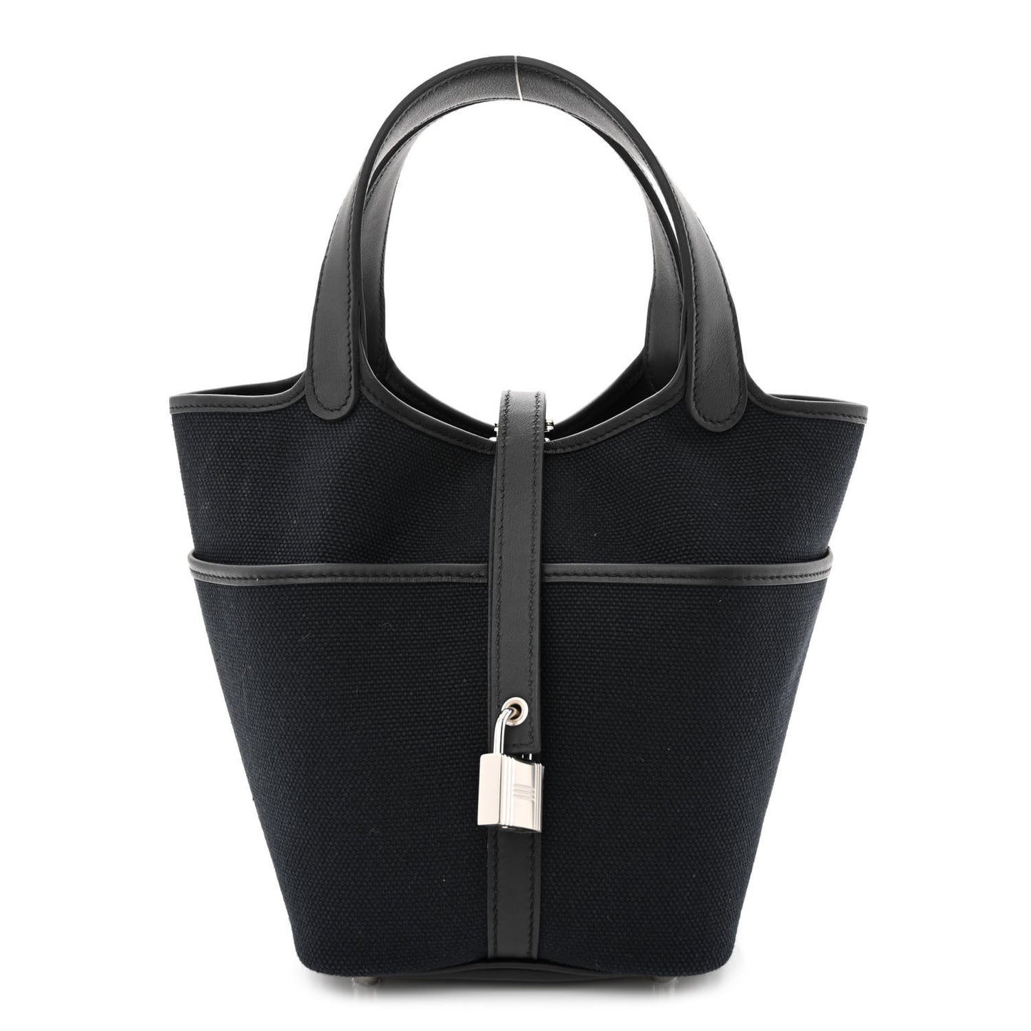 This is an authentic HERMES Toile Goeland Swift Cargo Picotin Lock 18 in Black. This chic and lovely tote is crafted of sturdy canvas in black. The bag features looping leather top handles, exterior pockets, and silver hardware, including a lock and keys. The bag has an open top and a matching canvas interior.Follow this item for alerts. Hermes is a registered trademark of Hermes. FASHIONPHILE is not affiliated with Hermes.
