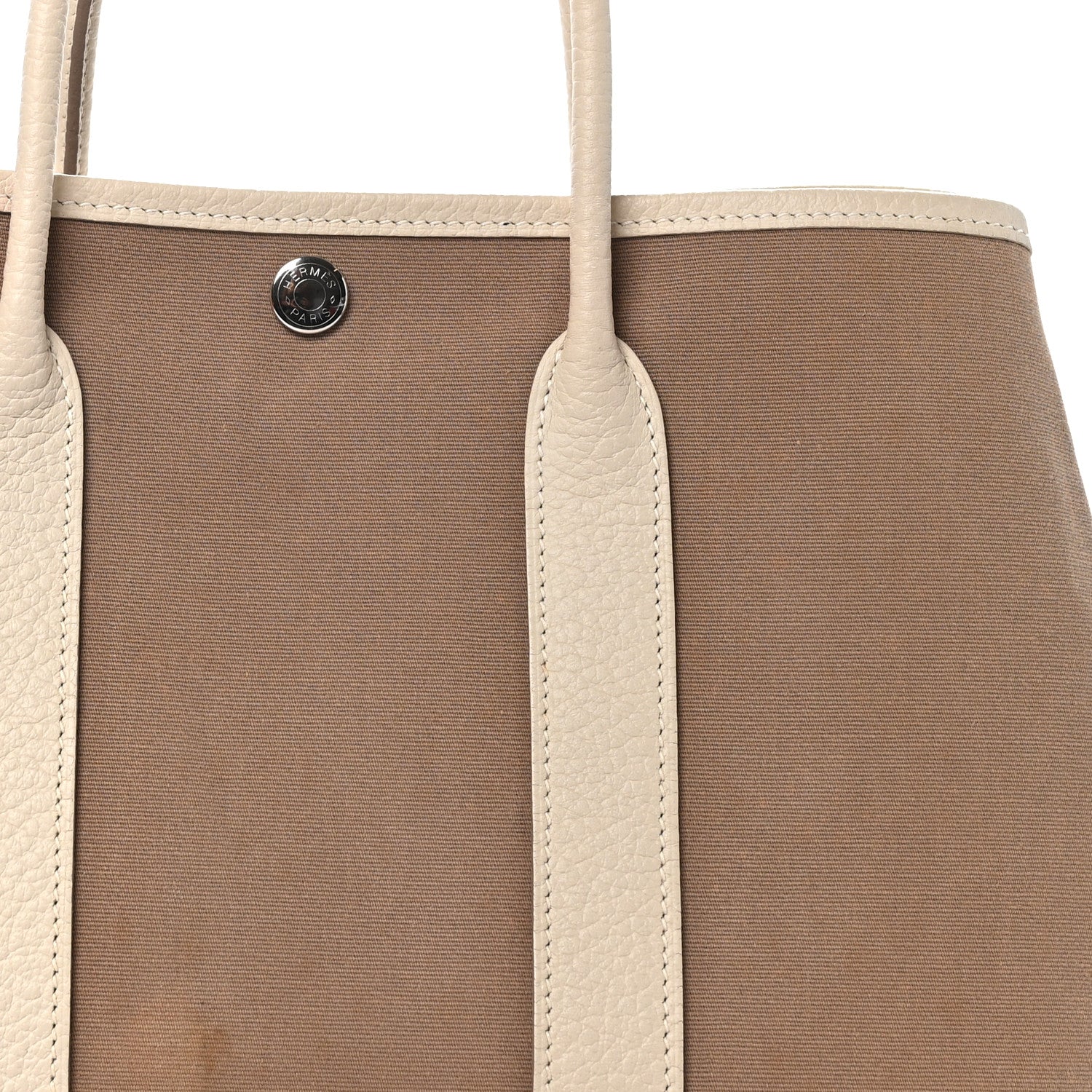 This is an authentic HERMES Toile Negonda Garden Party 30 TPM Tote in Craie and Etoupe. This mini tote is crafted of taupe canvas with off-white leather trim. The bag features matching leather top handles, side snaps, and a top snap that opens to a matching canvas and leather interior.Follow this item for alerts. Hermes is a registered trademark of Hermes. FASHIONPHILE is not affiliated with Hermes.