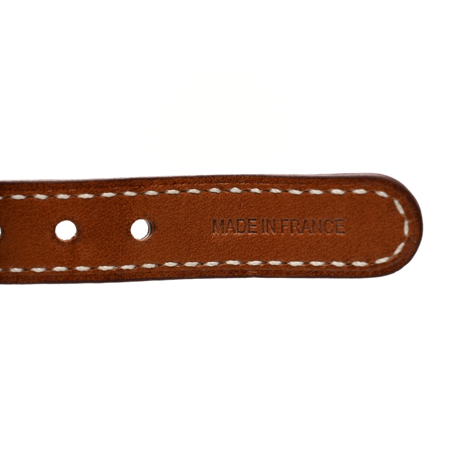 This is an authentic HERMES Toile Swift Cavale CDC Bracelet Capucine in Magnolia and Gold. Collier de Chien simply means "dog collar" and this sporty bracelet replicates the elements of a dog collar in a way that is sophisticated and stylish. This features a fabric band of woven canvas swift calfskin closure buckle straps in brown with a multicolor embroidery and silver plated adjustment hardware with iconic studded detail.Follow this item for alerts. Hermes is a registered trademark of Hermes. FASHIONPHILE is not affiliated with Hermes.