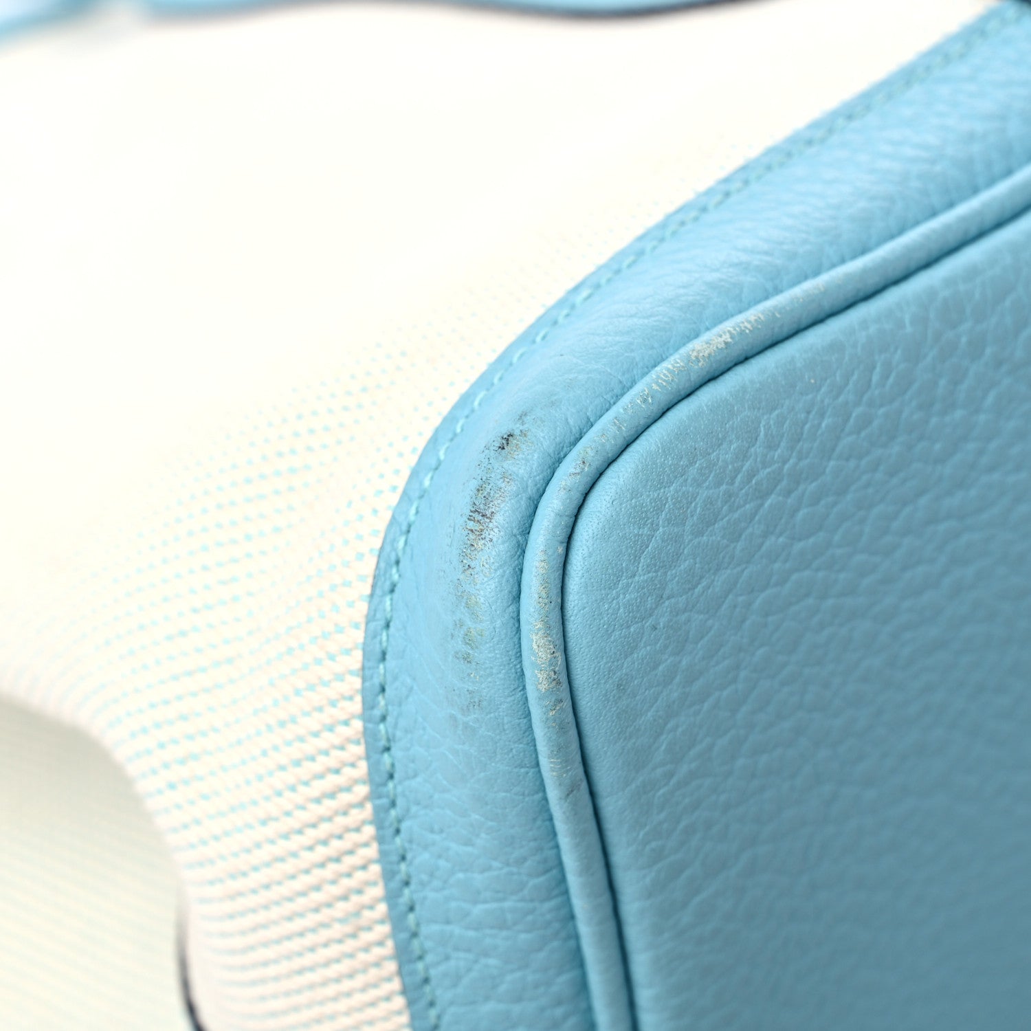 This is an authentic HERMES Twill H Vache Country Garden Party 36 MM in Bleu Atoll. This sophisticated bag has a casual appeal with a structured shape of natural toile canvas that is durable and strong. The handbag is reinforced with sky blue pebbled leather trim including a solid leather base and leather straps that extend into rolled top handles. The palladium snap opens to a spacious canvas interior with a leather base.Follow this item for alerts. Hermes is a registered trademark of Hermes. FASHIONPHILE is not affiliated with Hermes.