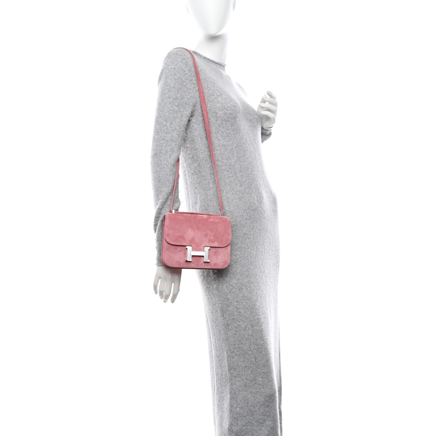 This is an authentic HERMES Veau Doblis Constance 18 in Rose Indienne. This classic bag is finely crafted of Veau Doblis suede leather in pink with a matching shoulder strap. The top flap opens with a palladium H clasp to a partitioned pink leather interior with patch pockets.