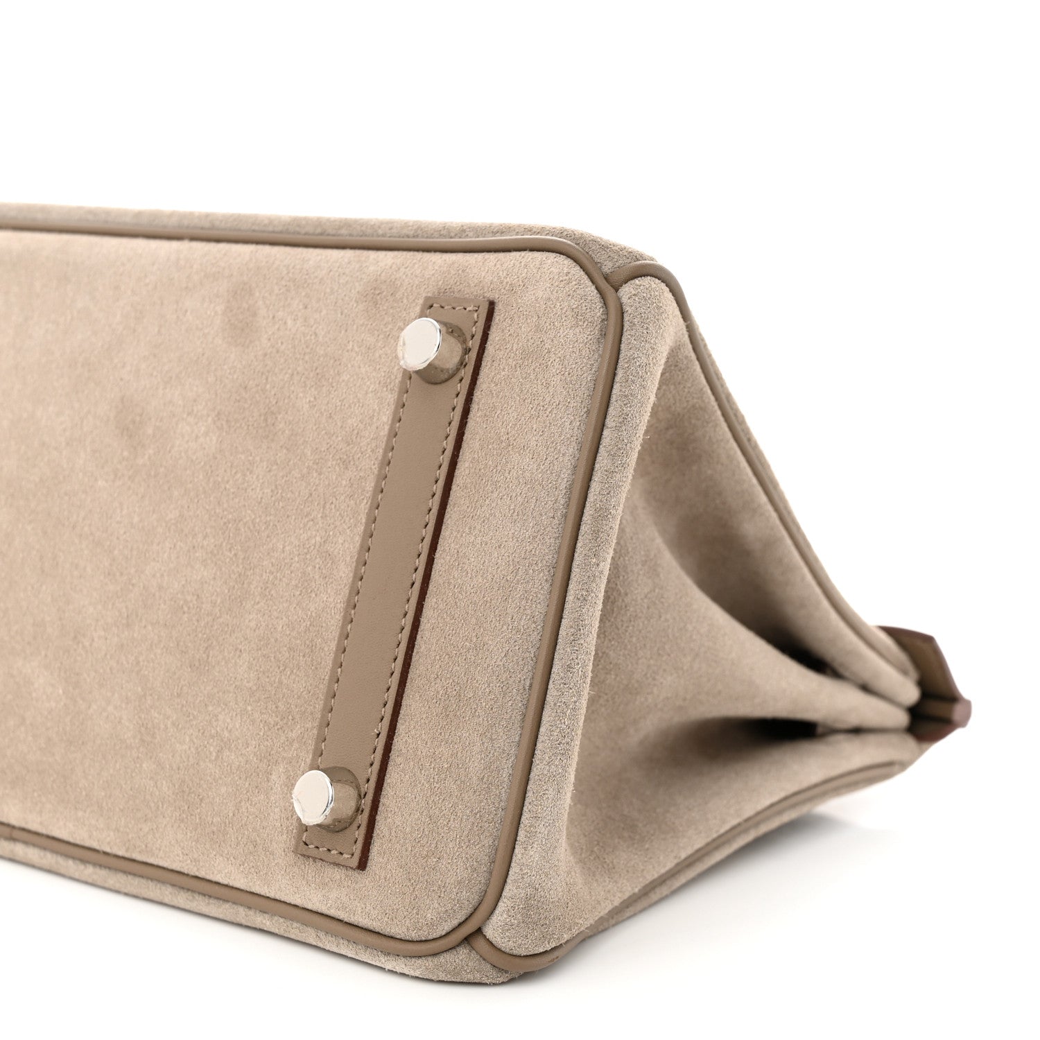 This is an authentic HERMES Veau Doblis Swift Grizzly Birkin 25 in Gris Caillou and Etoupe. This stunning Birkin tote is beautifully crafted of Veau Doblis suede leather paired with taupe calfskin leather. This stunning bag features rolled leather top handles, a crossover flap with a locking strap closure, and polished palladium hardware including a silver turn lock with a leather clochette and keys. This opens to a leather-lined interior with zippered and patch pockets.