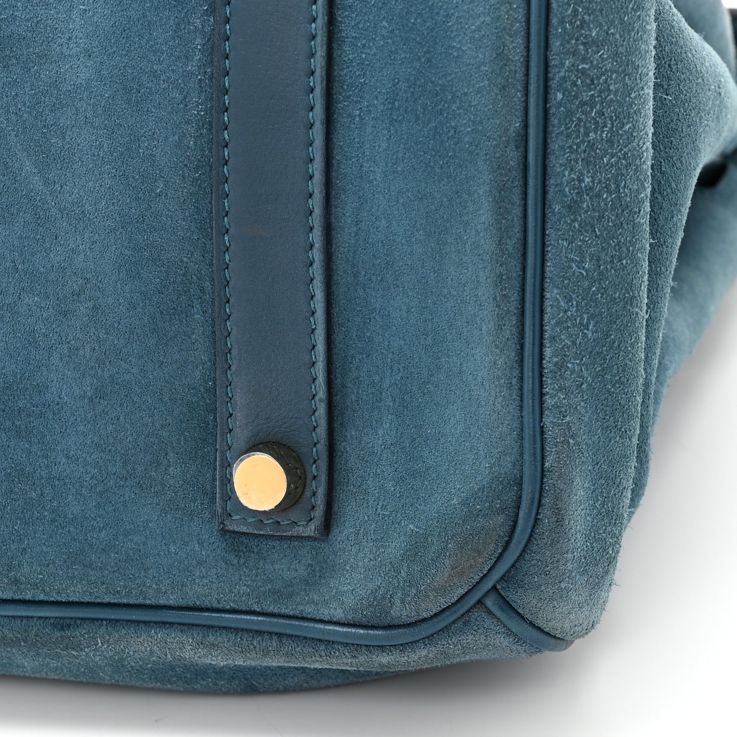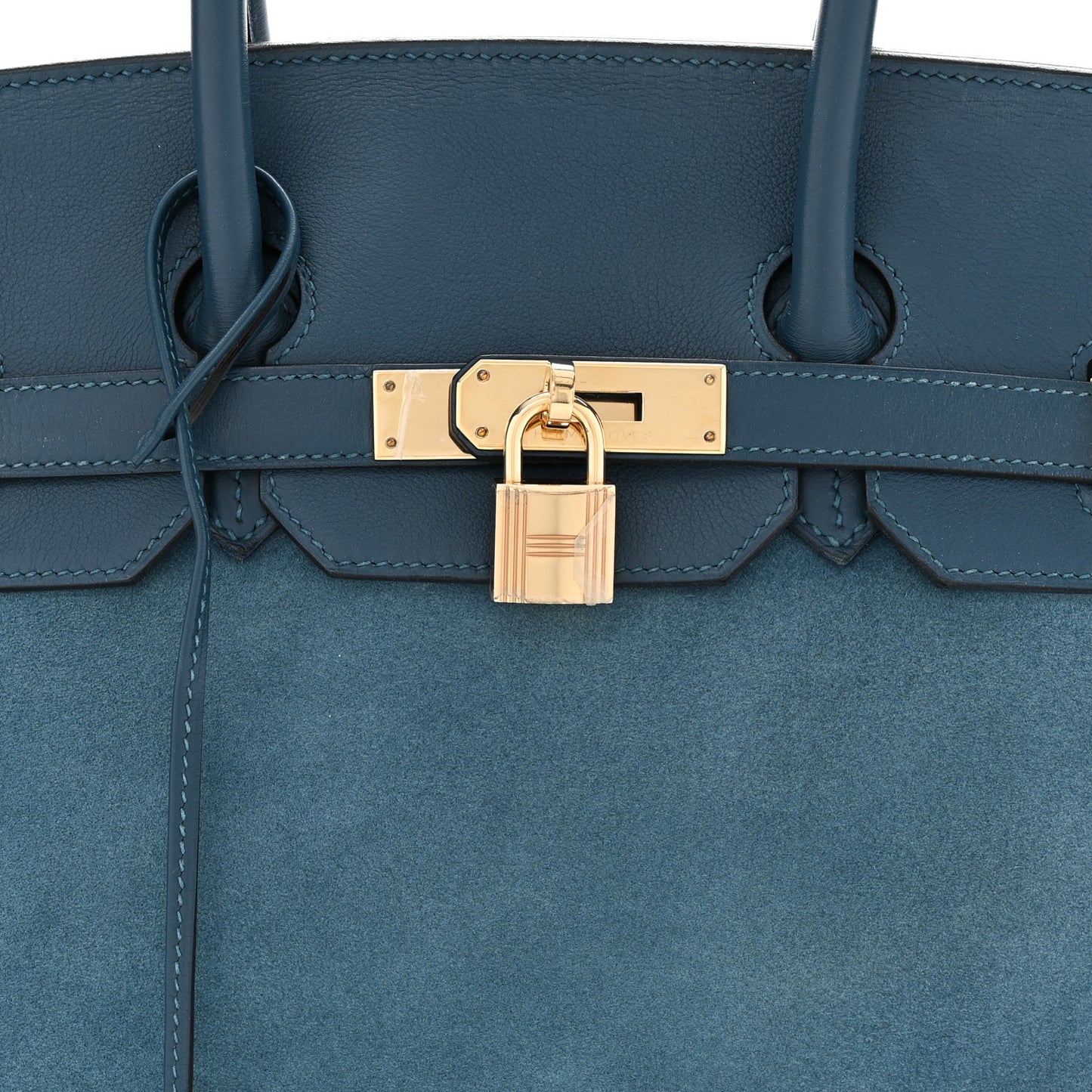 This is an authentic HERMES Veau Doblis Swift Grizzly Birkin 35 in Bleu Tempete. This stunning Birkin tote is beautifully crafted of Veau Doblis suede leather paired with matching blue calfskin leather. This stunning bag features rolled leather top handles, a crossover flap with a locking strap closure and polished gold permabrass hardware including a gold turn lock with a leather clochette and keys. This opens to a natural fabric interior with a leather zippered and patch pockets.