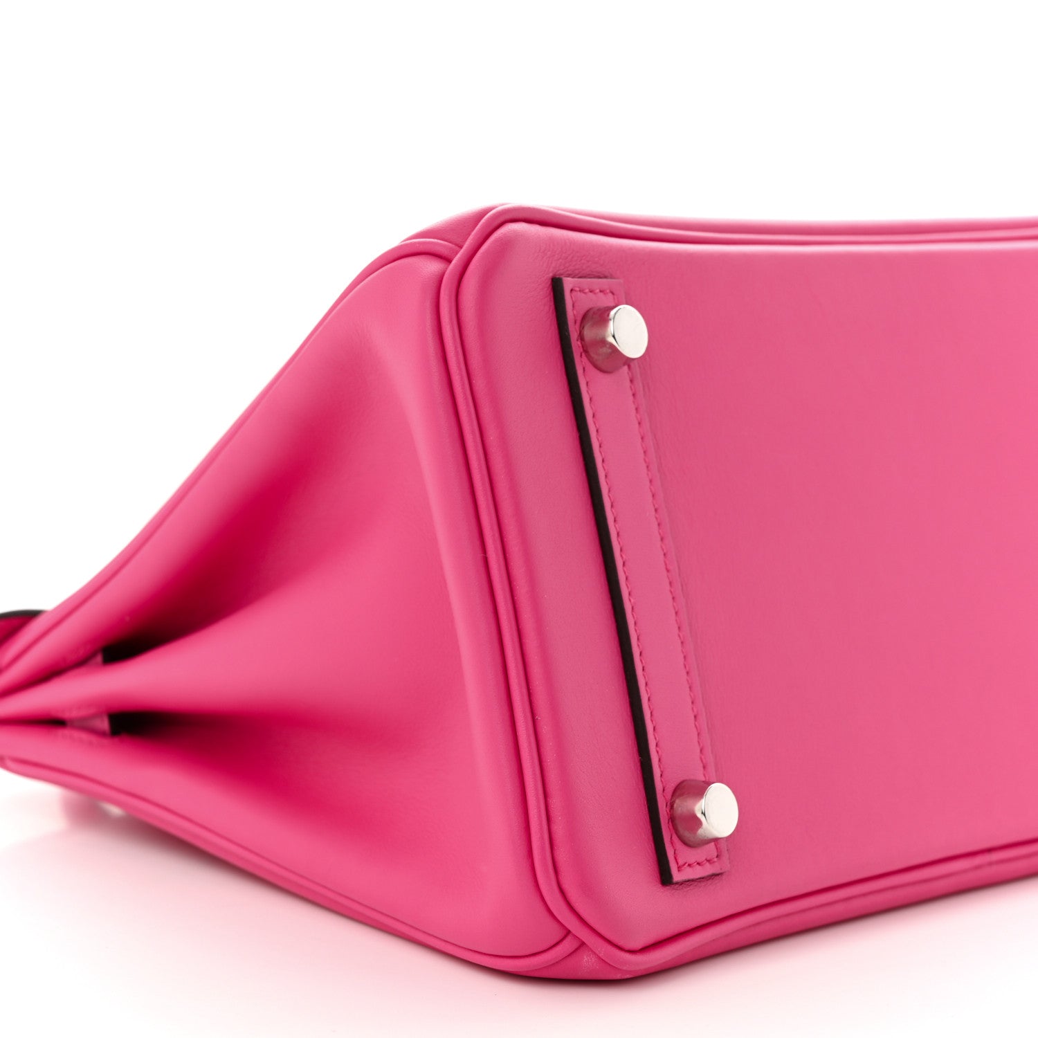 This is an authentic HERMES Swift Birkin 25 in Framboise. This classic handbag is beautifully crafted of supple swift leather with a fine grain in dark pink. The bag features rolled leather top handles, a frontal flap and strap closure and palladium silver hardware including a turn lock and keys in the clochette. This opens to a matte leather interior with zipper and patch pockets.Follow this item for alerts. Hermes is a registered trademark of Hermes. FASHIONPHILE is not affiliated with Hermes.