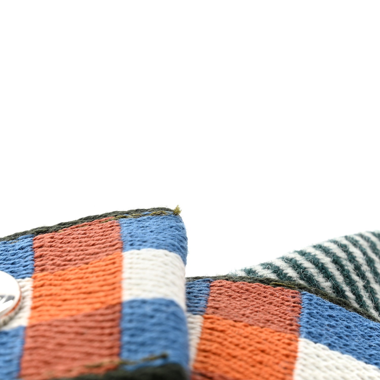 This is an authentic HERMES Wool Small Bride-A-Brac H Natte Pouch in Vert Foret. The pouch is crafted of green wool and consists of a snap closure on the top handle, along with a orange, blue and white checkerboard strap around the bag. The top zipper opens to a beige fabric interior with patch pockets.
